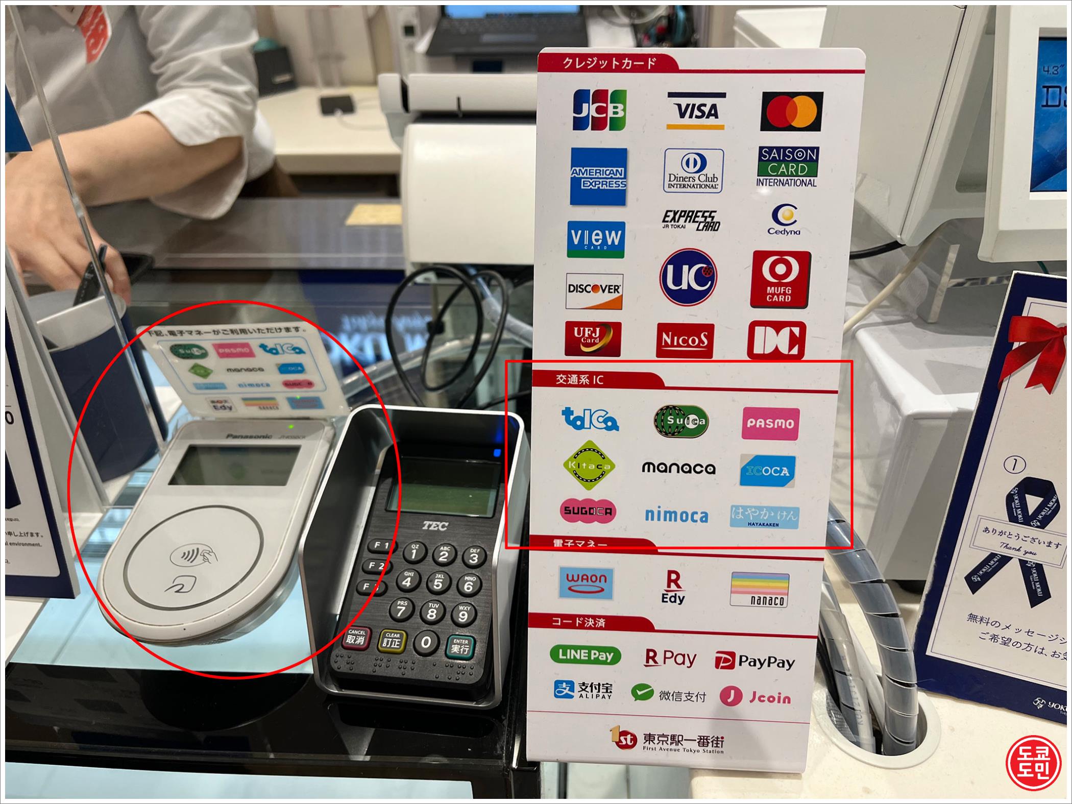 지불할때 계산대 앞에 SUICA, PASMO 라고 적혀있으면 그냥 교통카드를 보여주면 여기에 터치하라고 안내해줄꺼에요.