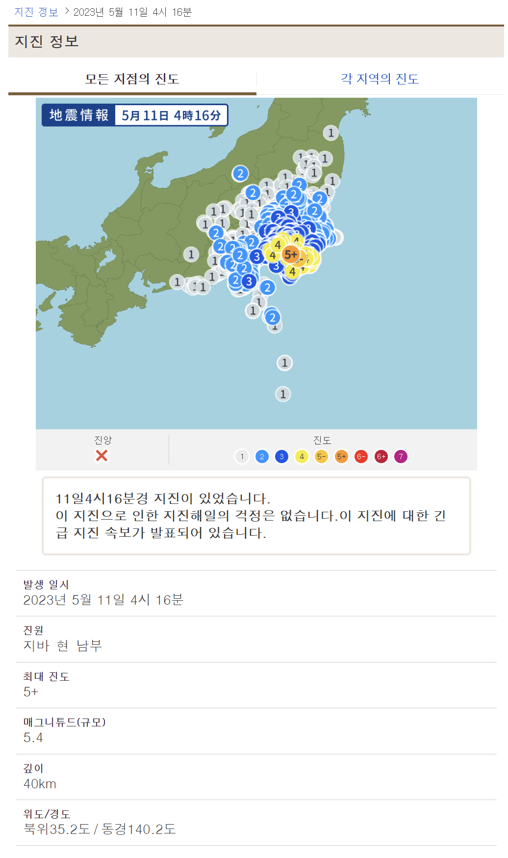 진원지는 도쿄 바로 옆인 나리타공항이 있는 지바현(치바현)으로 진도 5강이라면 꽤 많이 흔들린거지만, 그래도 지진이 길게 온게 아니라 큰 문제는 없습니다.