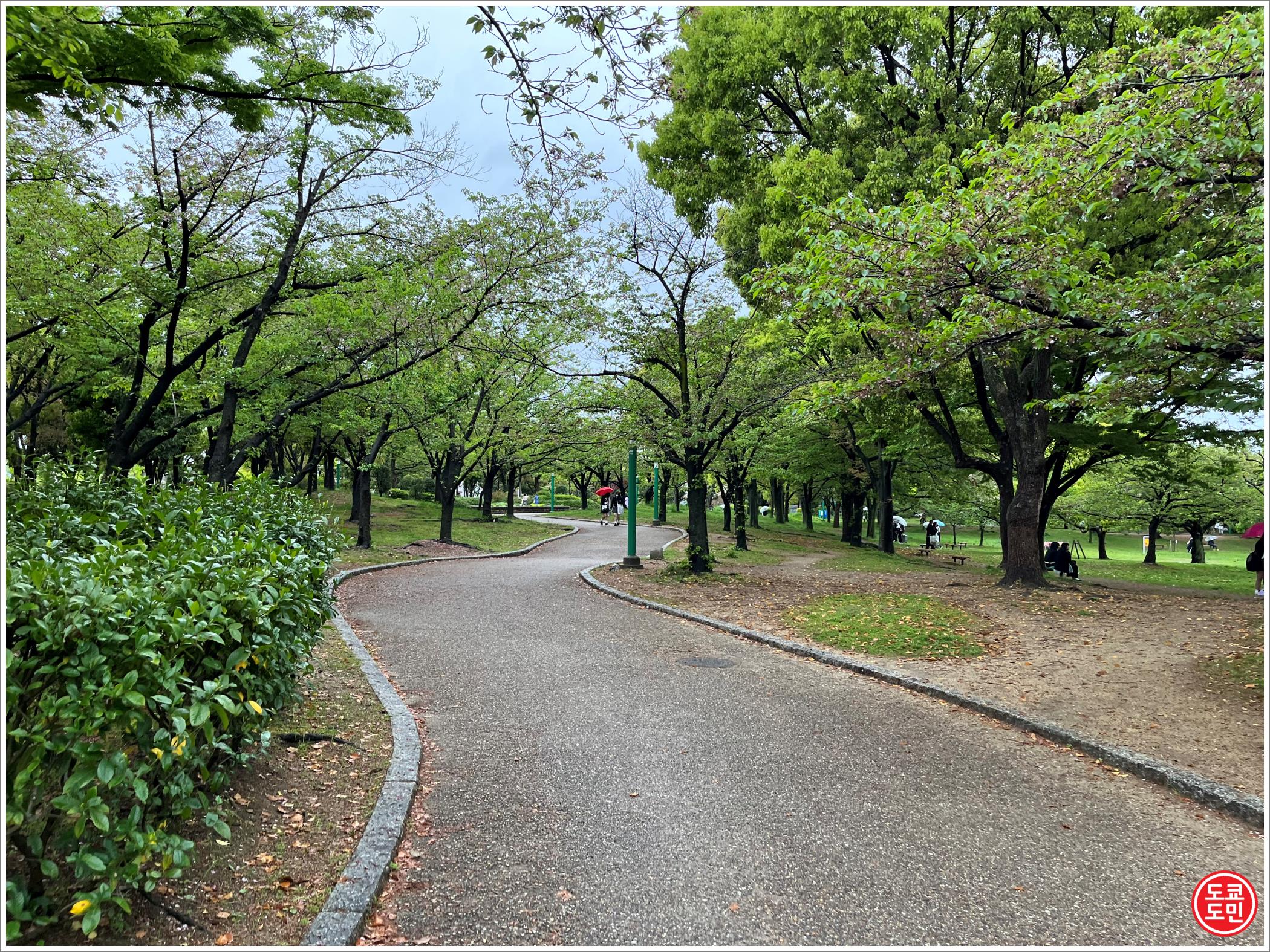 "마루젠 인덱스 아리나 오사카(丸善インテックアリーナ大阪)" 위에는 나무들이 많이 심어져있고, 실제로 올라갈 수 있는 산책로도 만들어져 있어서 올라갈 수 있습니다.