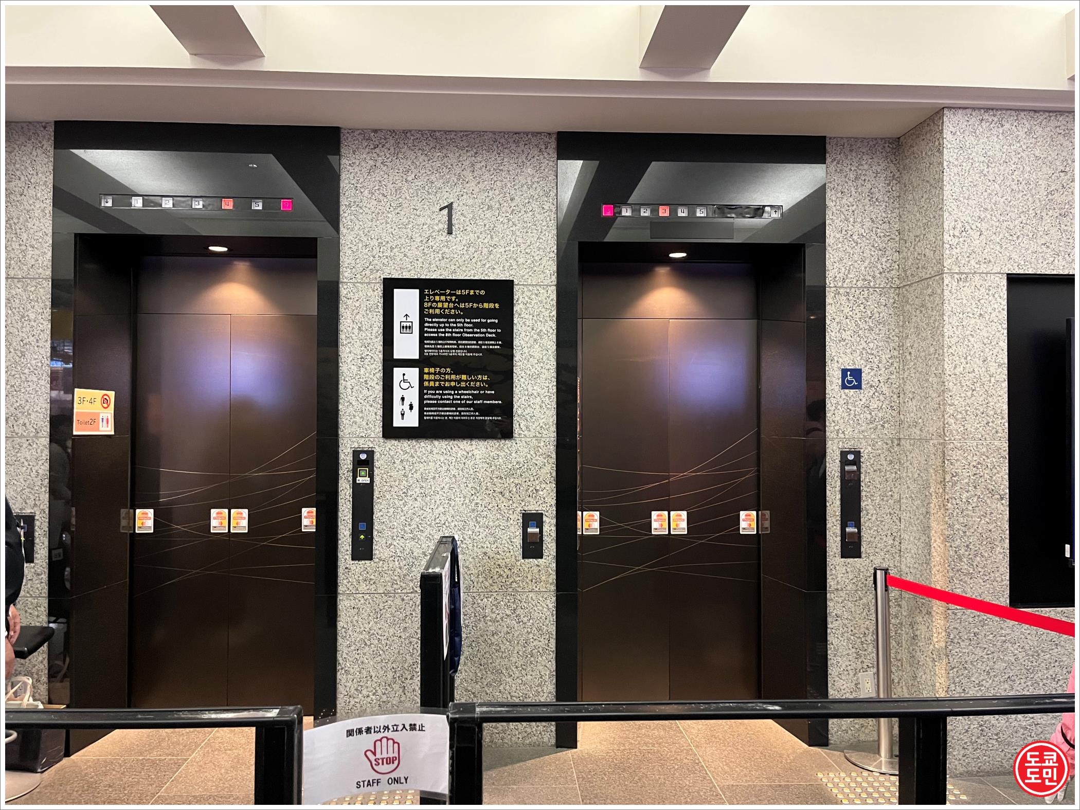 왼쪽에 줄서 있는 사람은 엘리베이터를 타고 올라가는 사람.