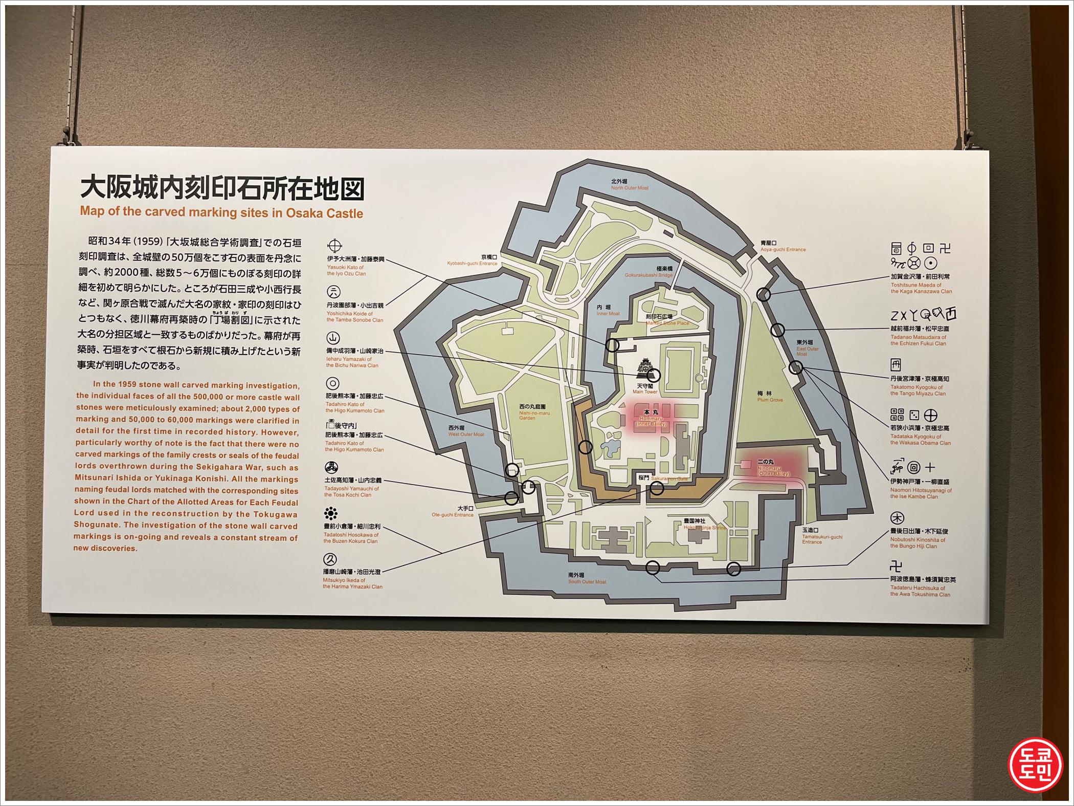 오사카성의 성벽이나 오카사성에 사용된 돌들에는 각인이 찍혀있는게 많이 있습니다.
