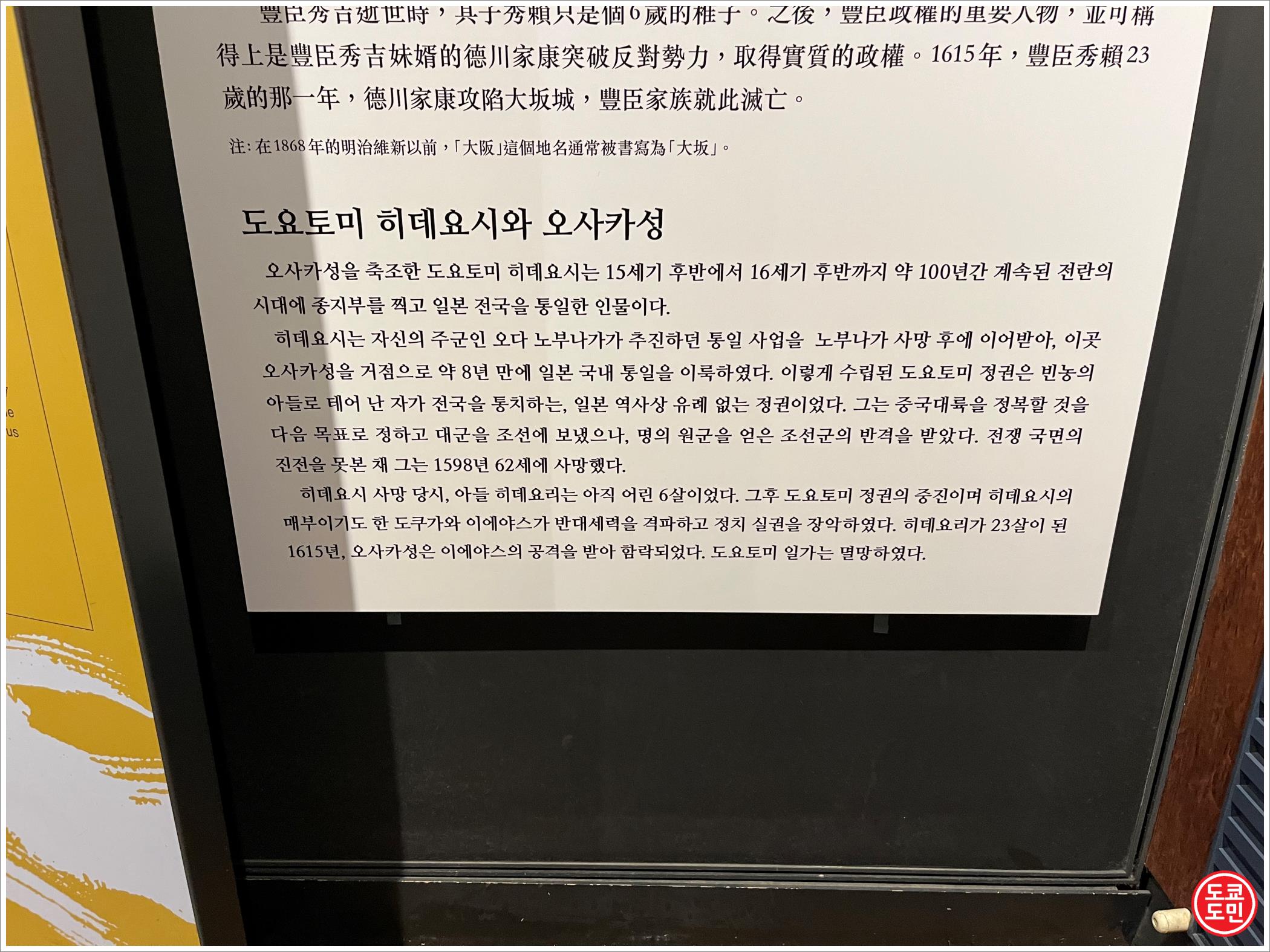 오사카성은 도요토미 히데요시가 처음에 세웠지만, 그 이후 도쿠가와 이에야스에 정권이 바뀌면서 그 전쟁으로 인해 오사카성은 다 무너졌습니다.