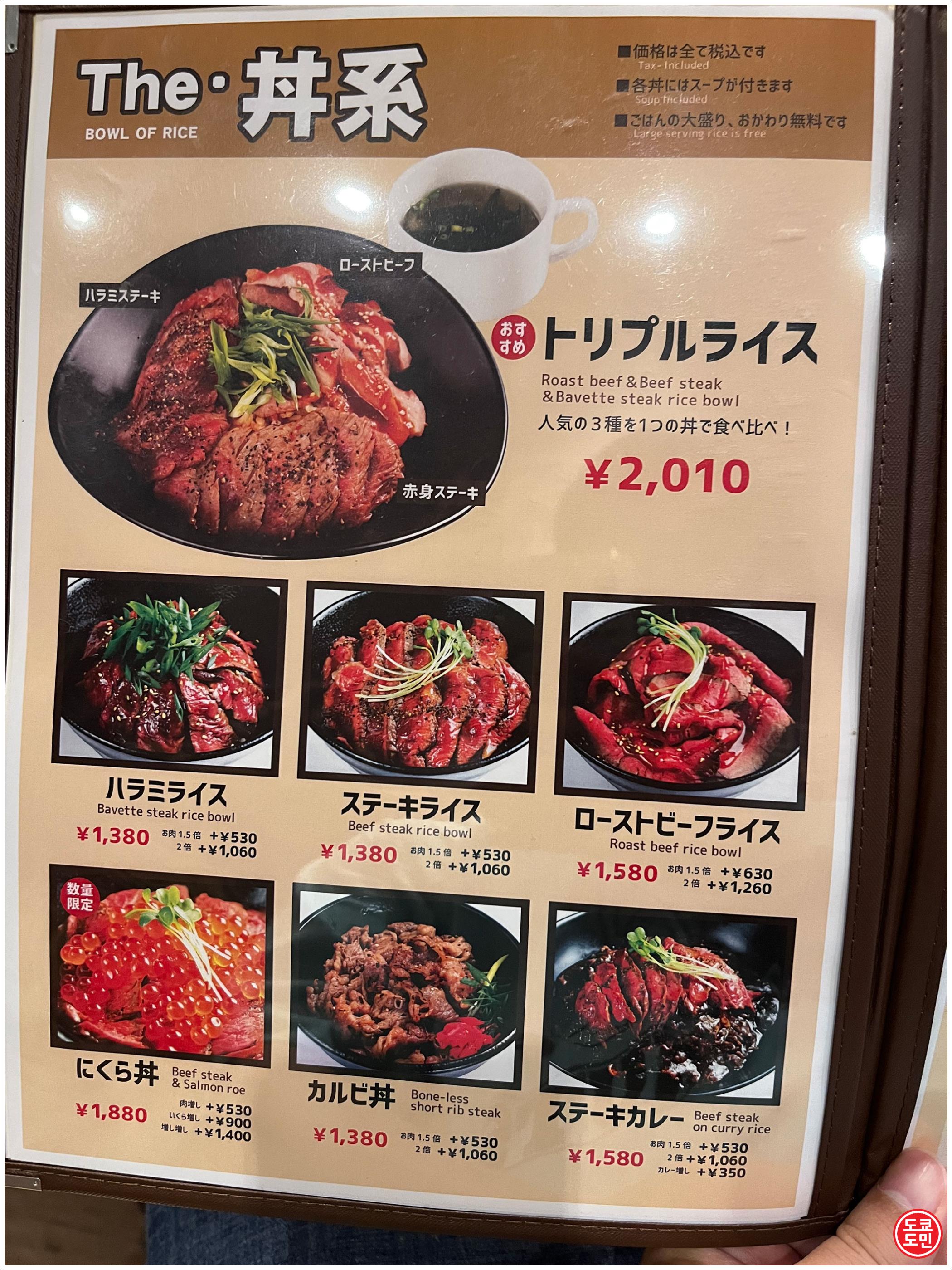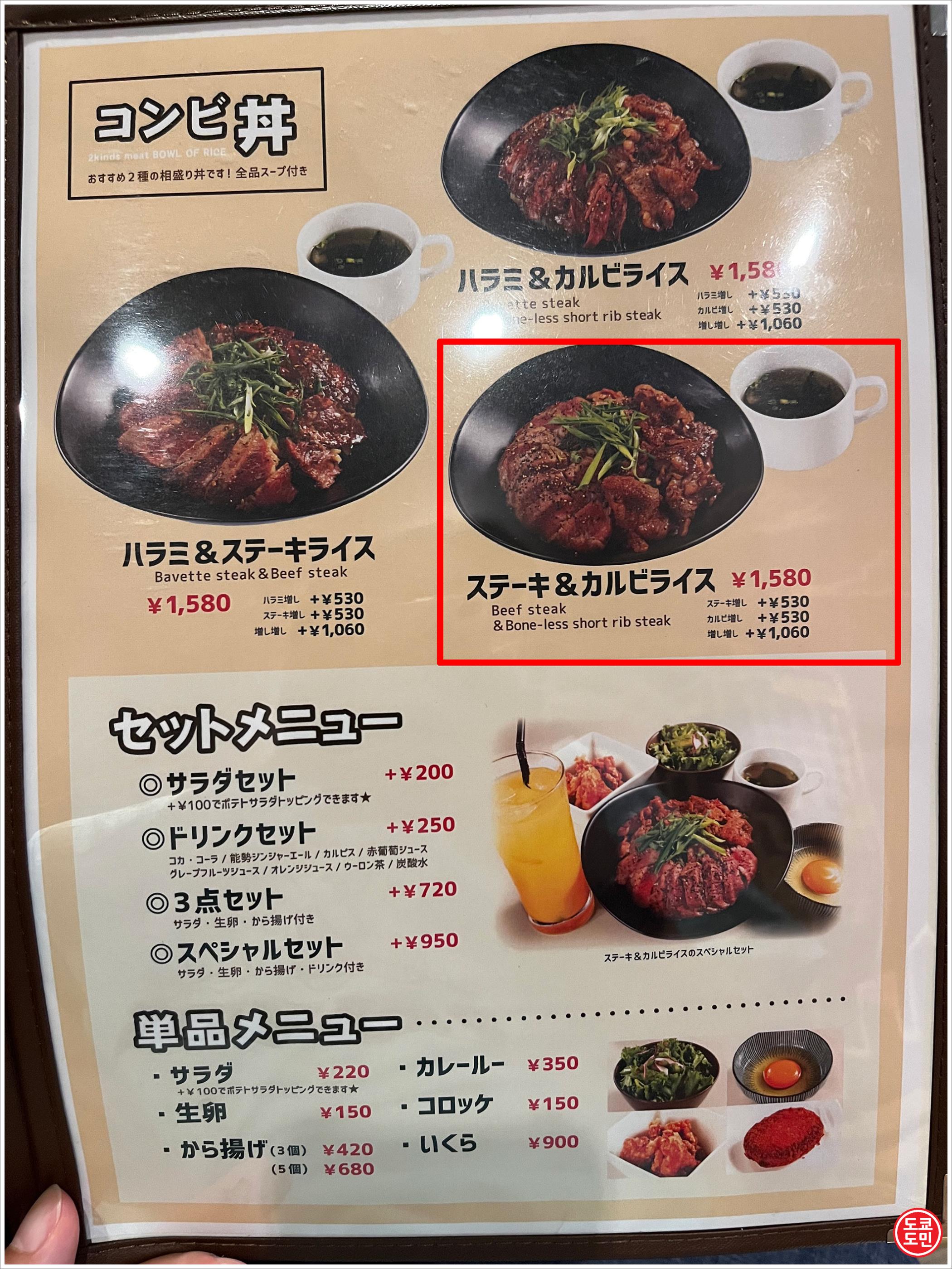 저는 이번에 빨간색으로 표시한 "스테이크&갈비 라이스(ステーキ&カルビライス)" 를 주문했습니다.