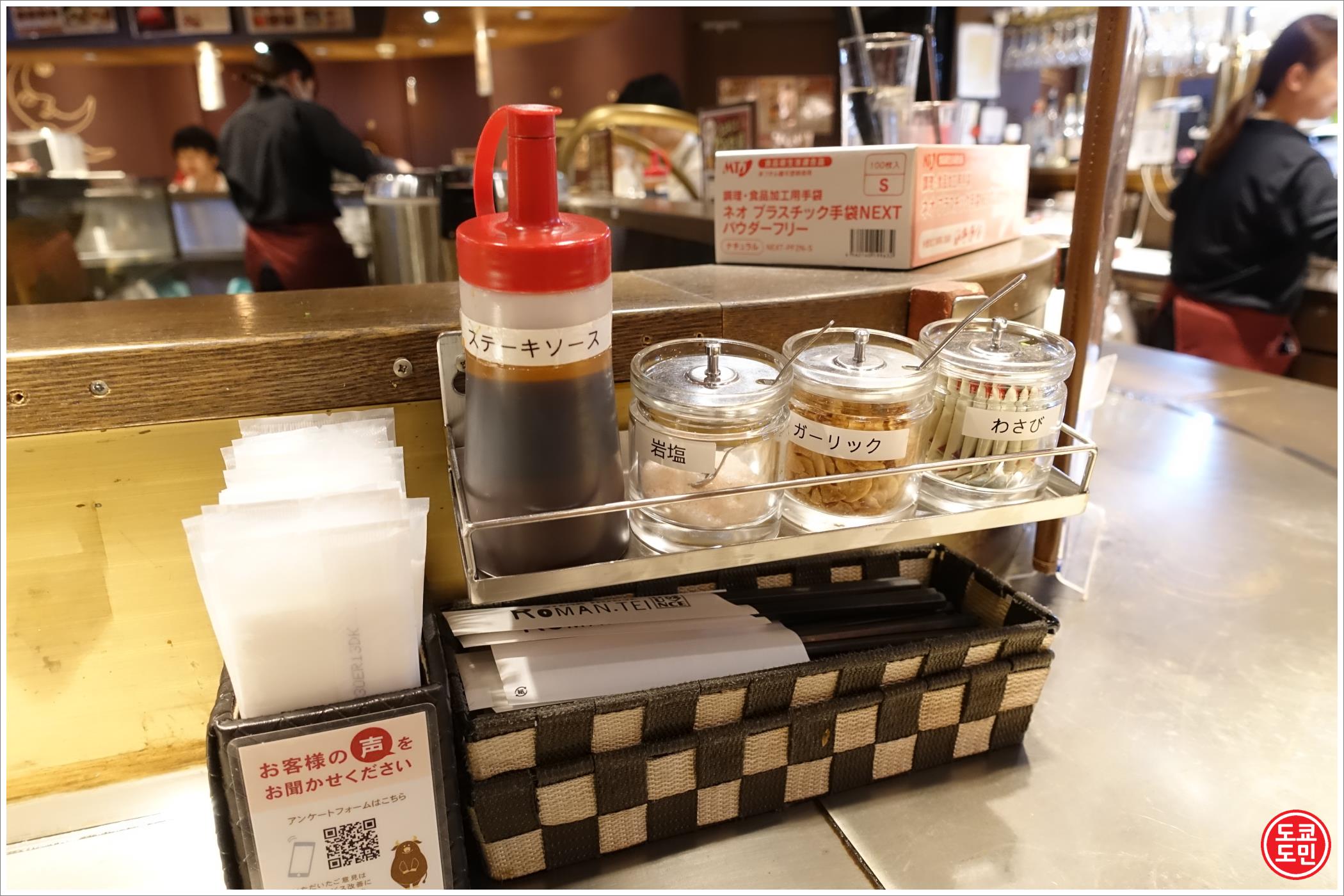 스테이크 소스, 소금, 갈릭, 와사비 순으로 조미료가 있습니다.