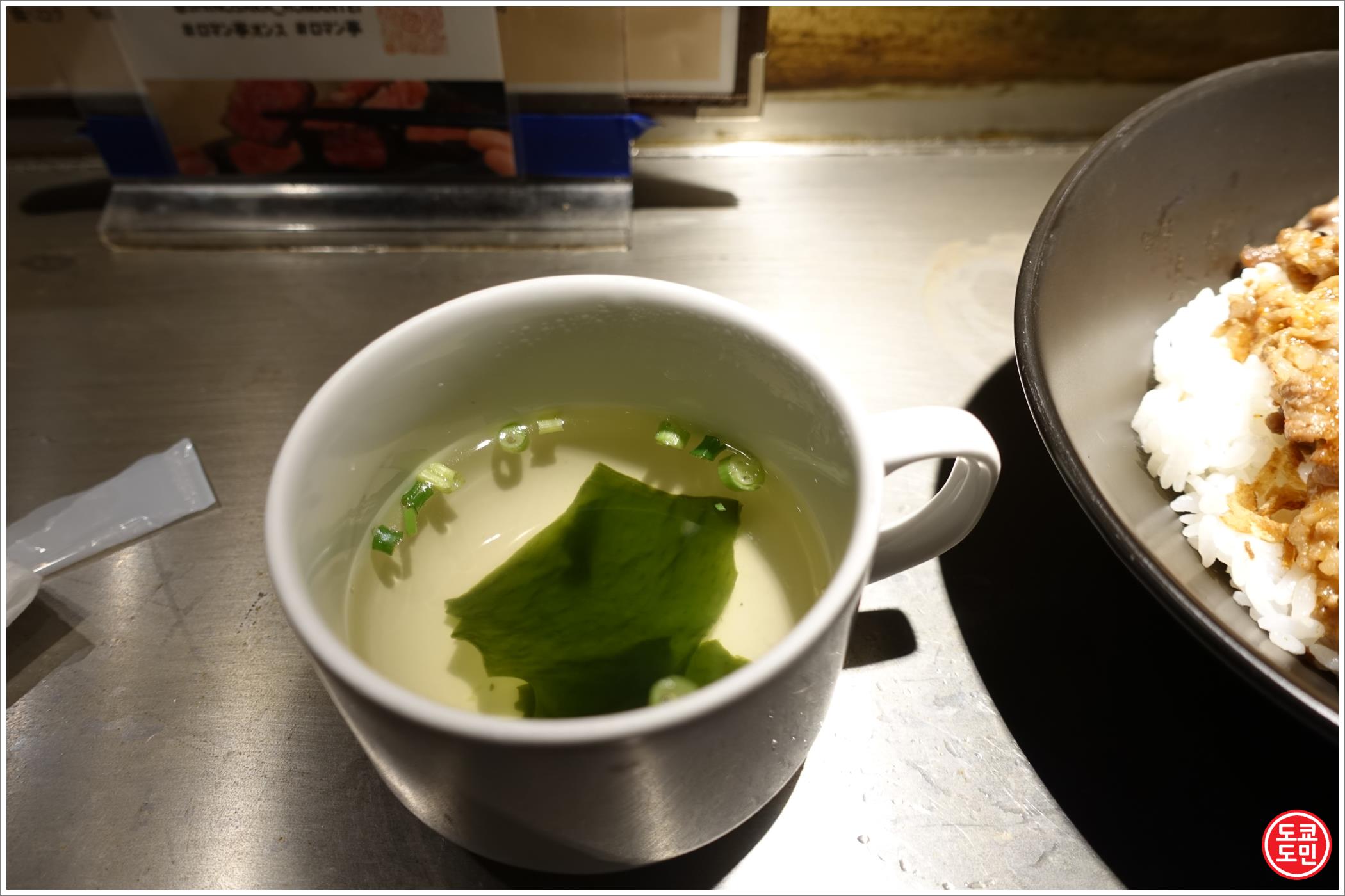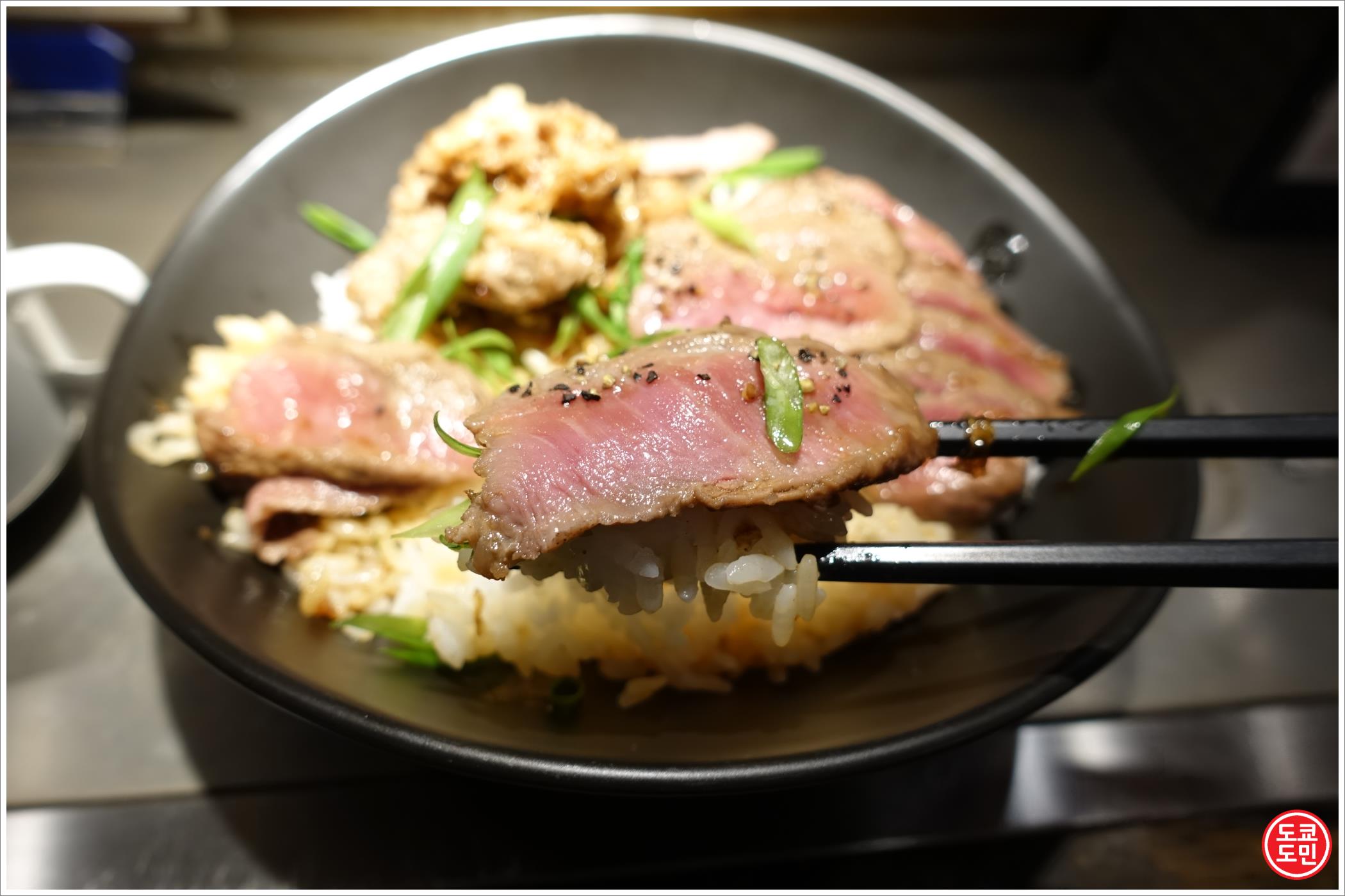 밥이랑 이렇게 드시면 되고, 카운터에 놓여 있는 와사비, 스테이크 소스, 소금 등을 첨가하셔서 드시면 더욱 맛있습니다.