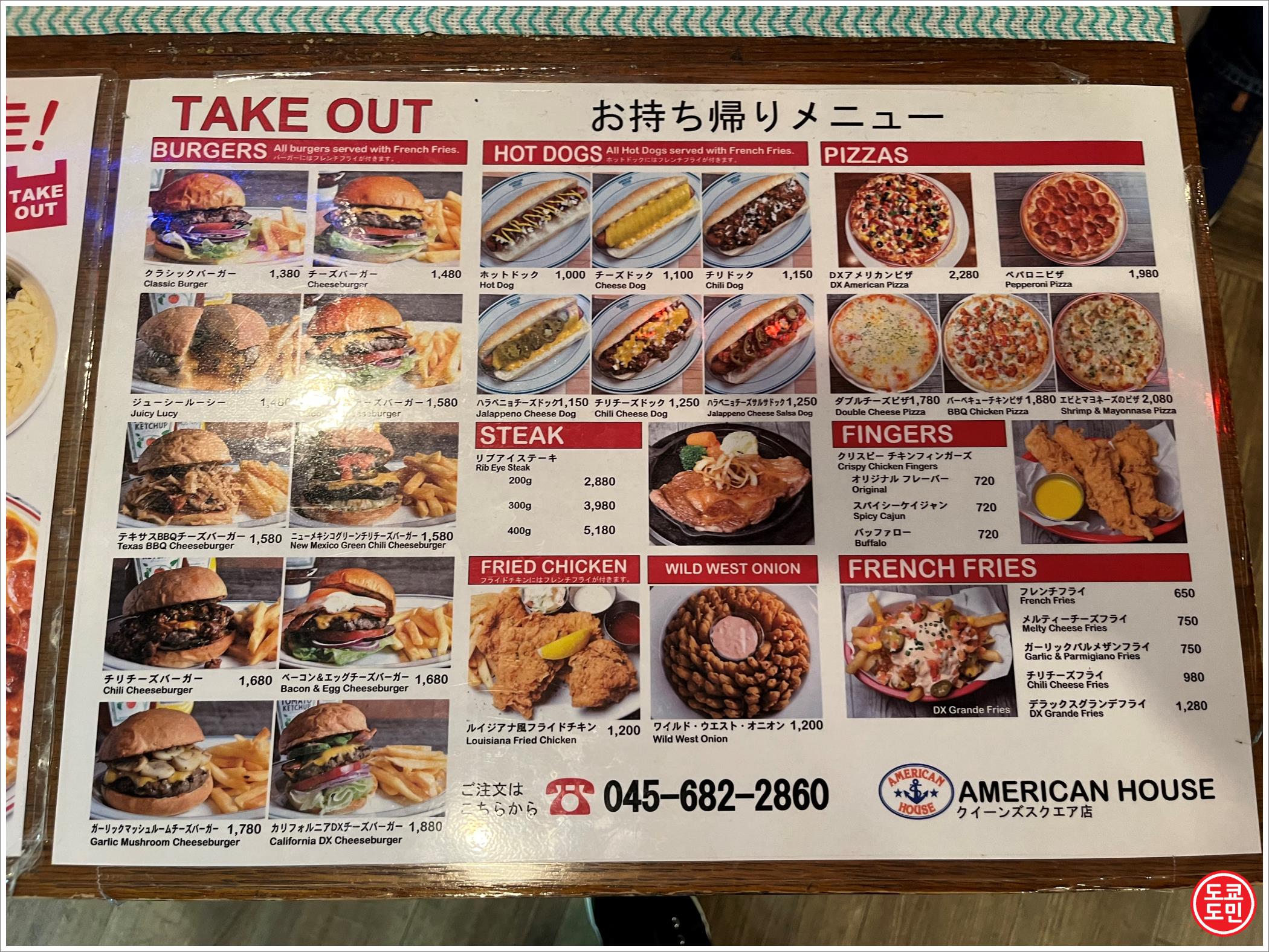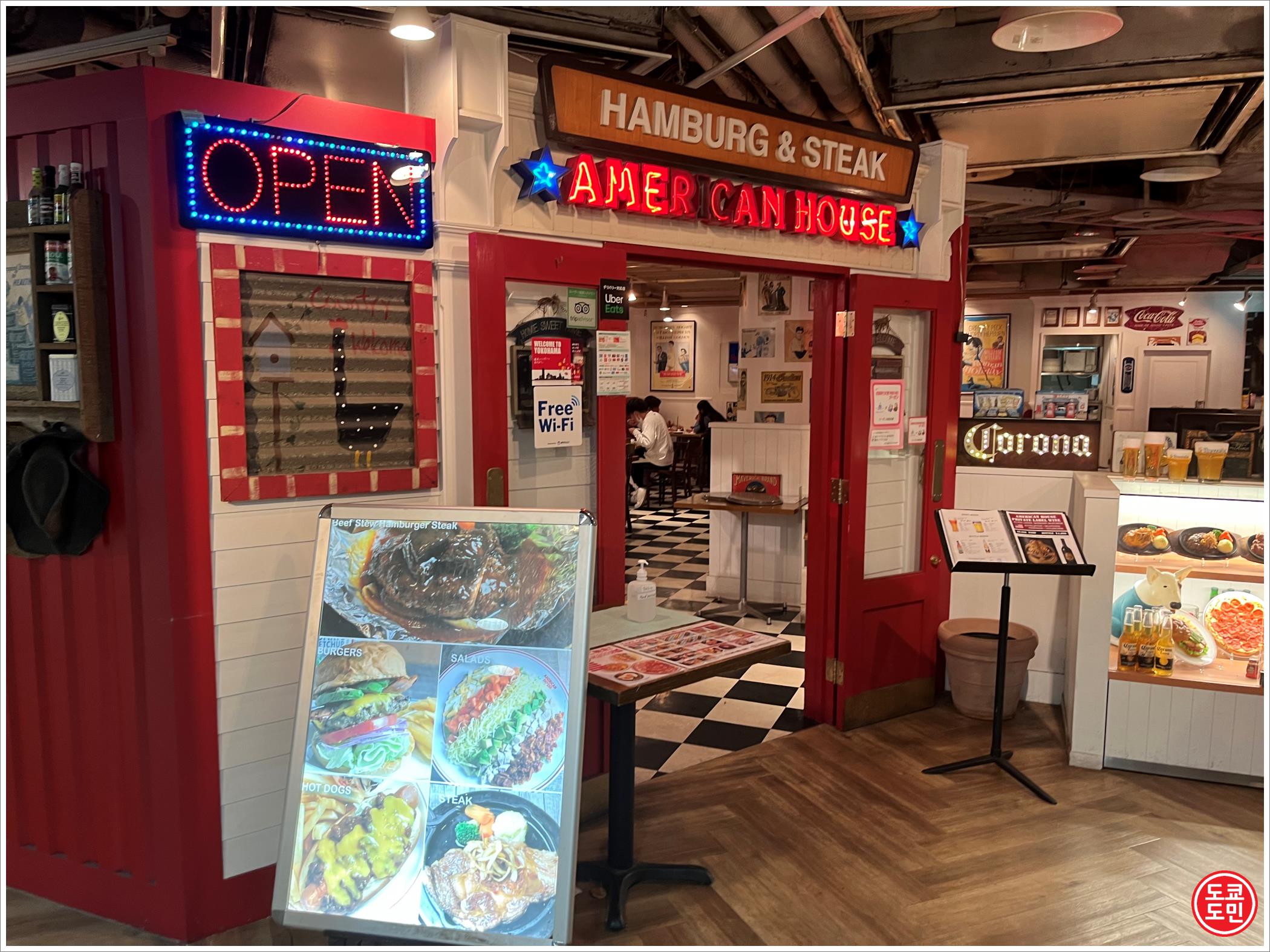 요코하마 미나토미라이역에 직결되어 있는 도큐스퀘어 1층에 있는 햄버거&스테이크 전문점 "아메리칸 하우스" 입니다.