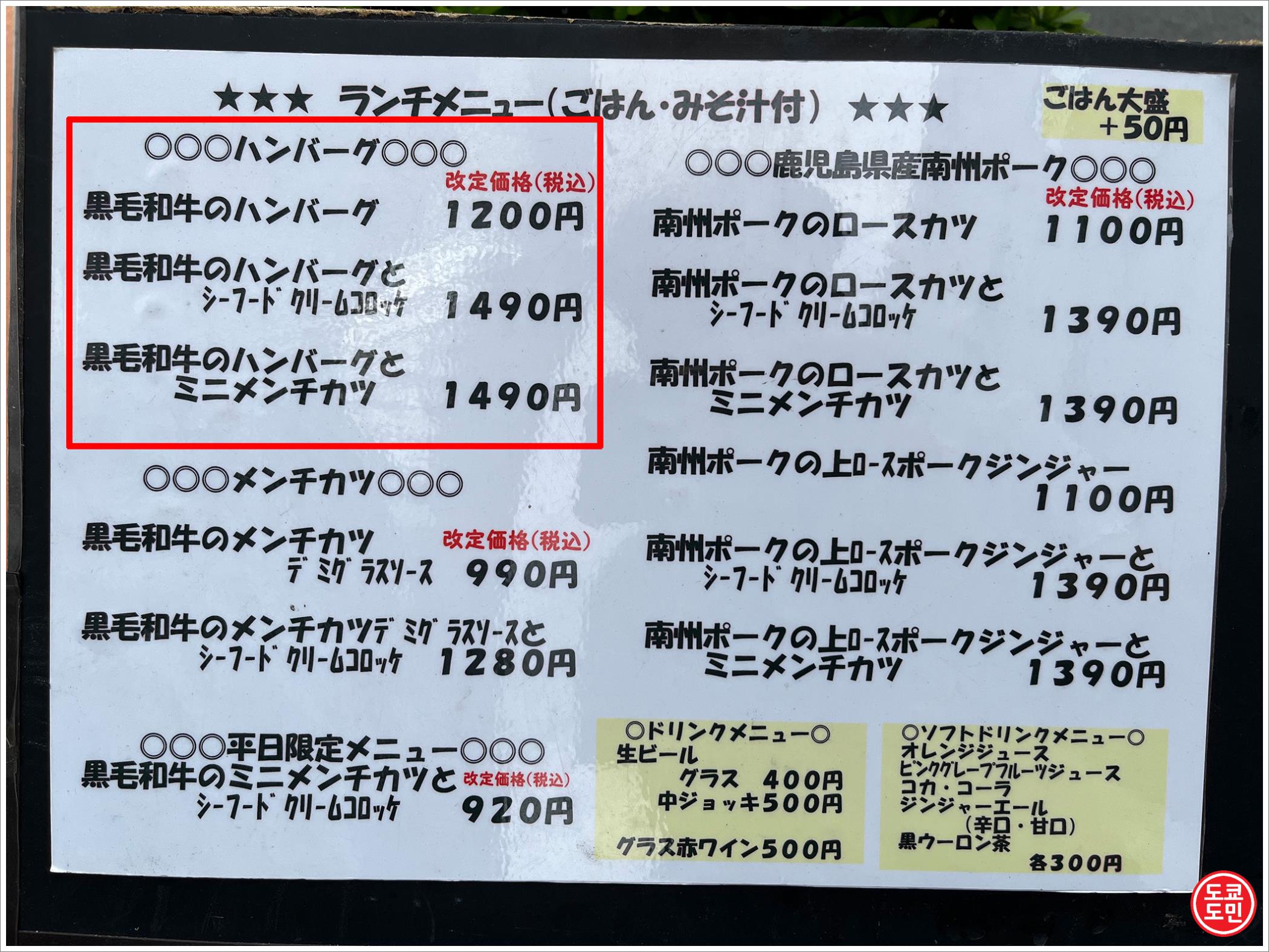 쿠로게와규 함바그(黒毛和牛のハンバーグ) 1200엔 (2023년 10월 기준).