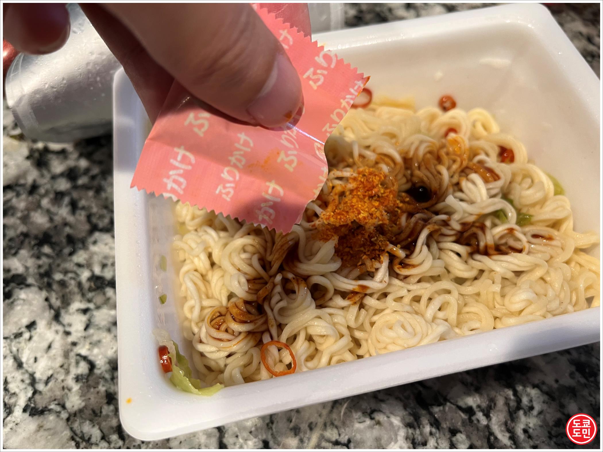 후리카케 라고 하는 매운 맛을 더해주는 고추가루를 넣습니다.