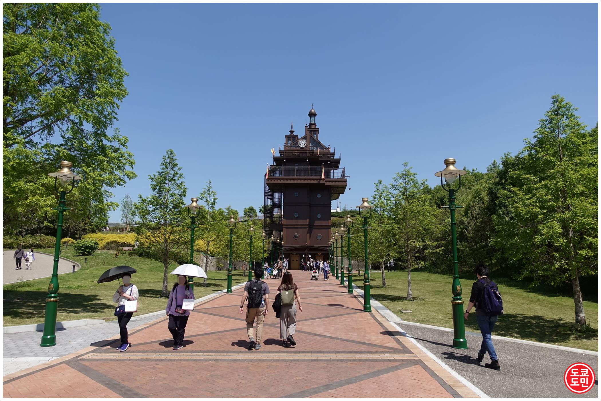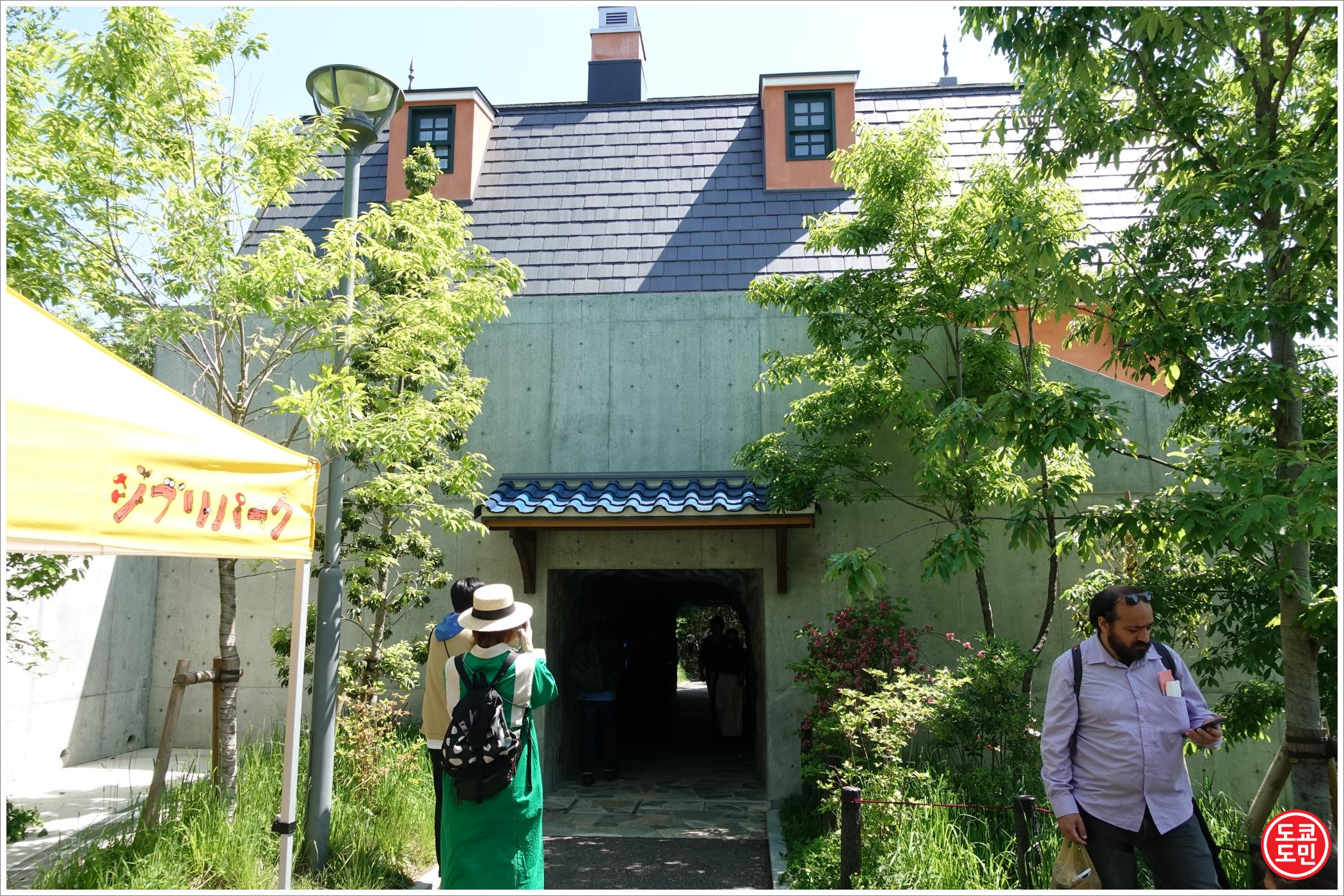 전철역에서 지브리파크로 가면 저 건물이 있는데, 저 건물에 엘리베이터를 타고 내려오면 바로 이 사진을 찍은 곳입니다.