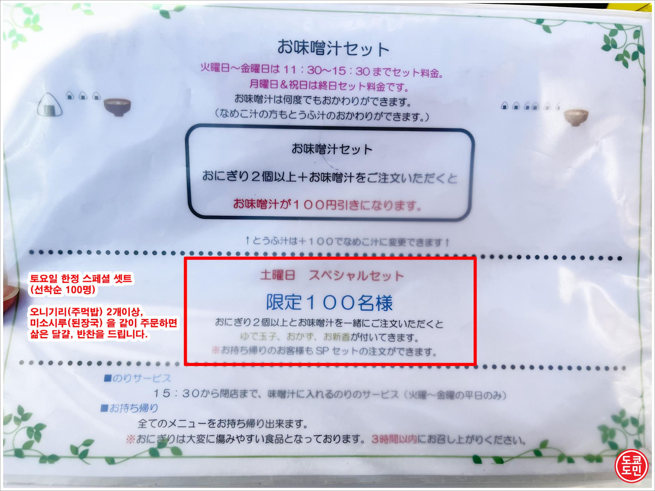 오니기리 2개이상, 미소시루(된장국)을 같이 주문하면 선착순 100명에게 삶은 달걀과 반찬이 제공됩니다.