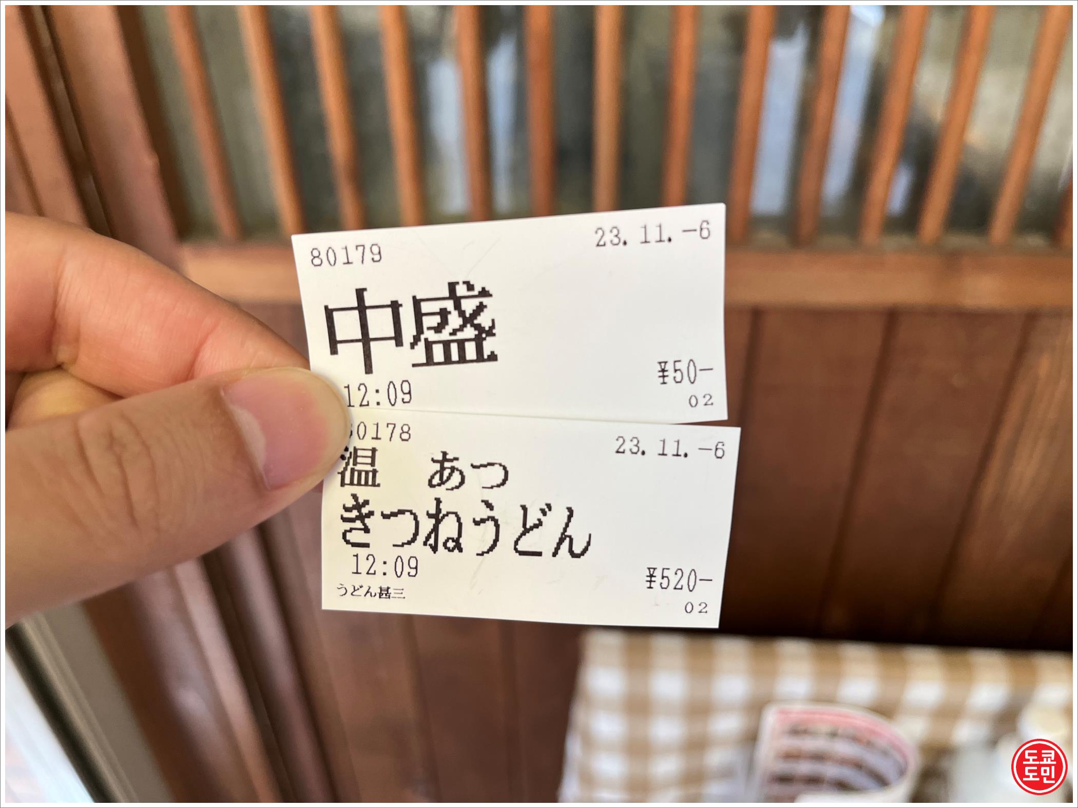 저는 제일 윗쪽줄에 오른쪽에서 3번째에 있는 520엔(약 5200원)짜리 키츠네 우동을 주문했습니다.