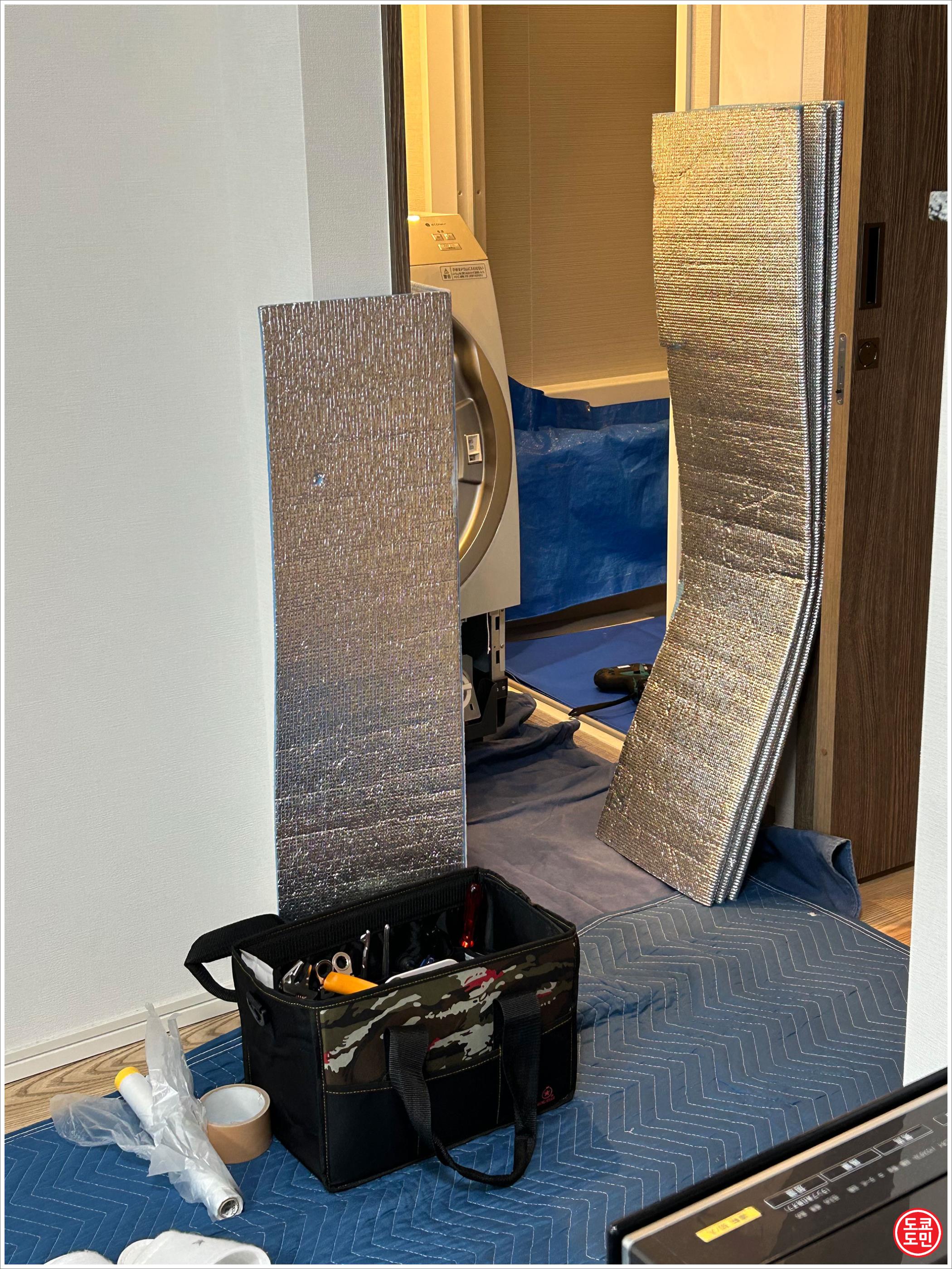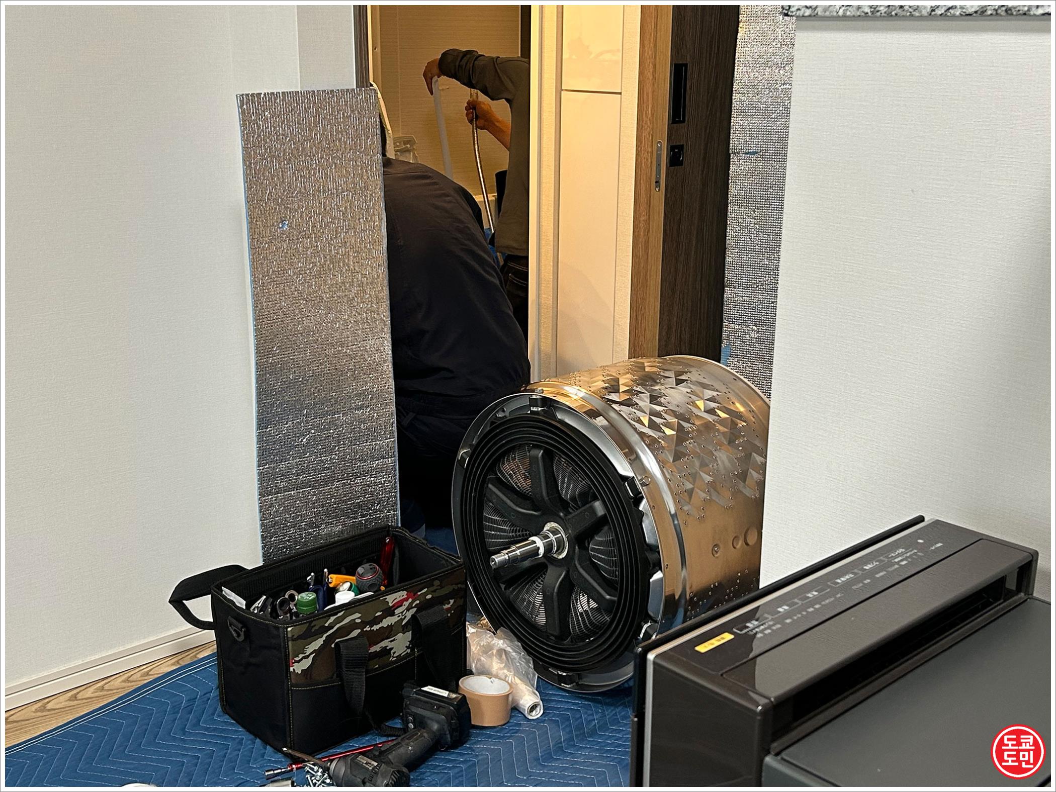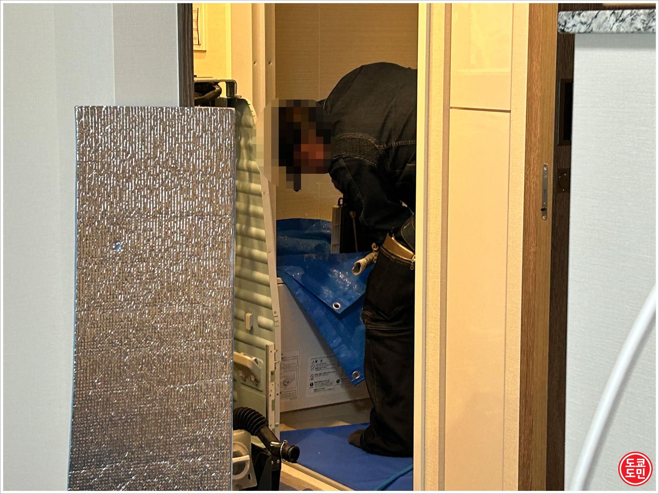 일본은 이렇게 고객의 집에 기스가 나지 않도록 저런거 다 깔고, 벽에도 부딪쳐도 기스가 나지 않게 스펀지 같은걸로 감싸고 작업한답니다.