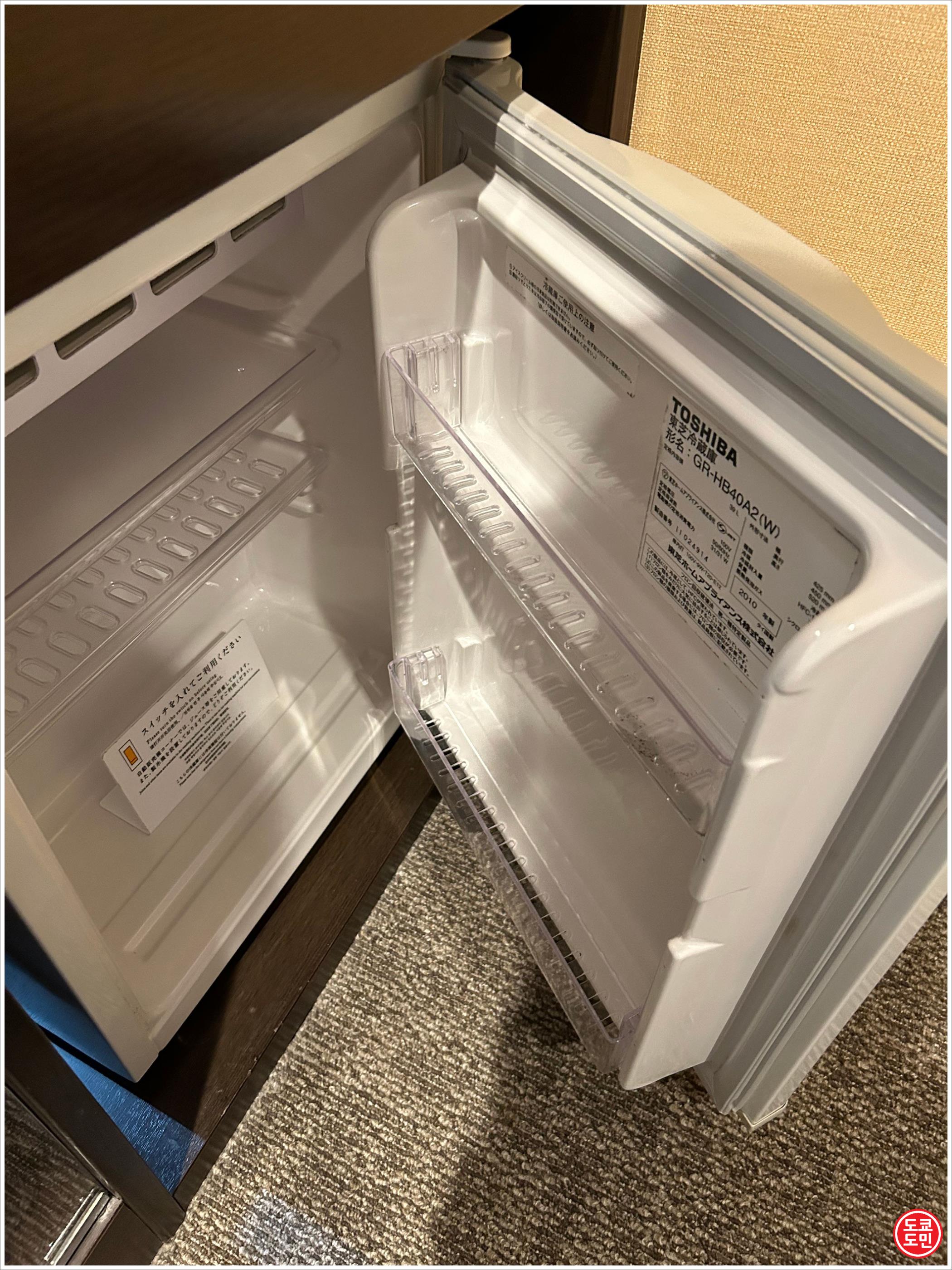 티비 밑에 냉장고가 있는데 바깥쪽에 냉장고 전원 스위치가 있습니다.