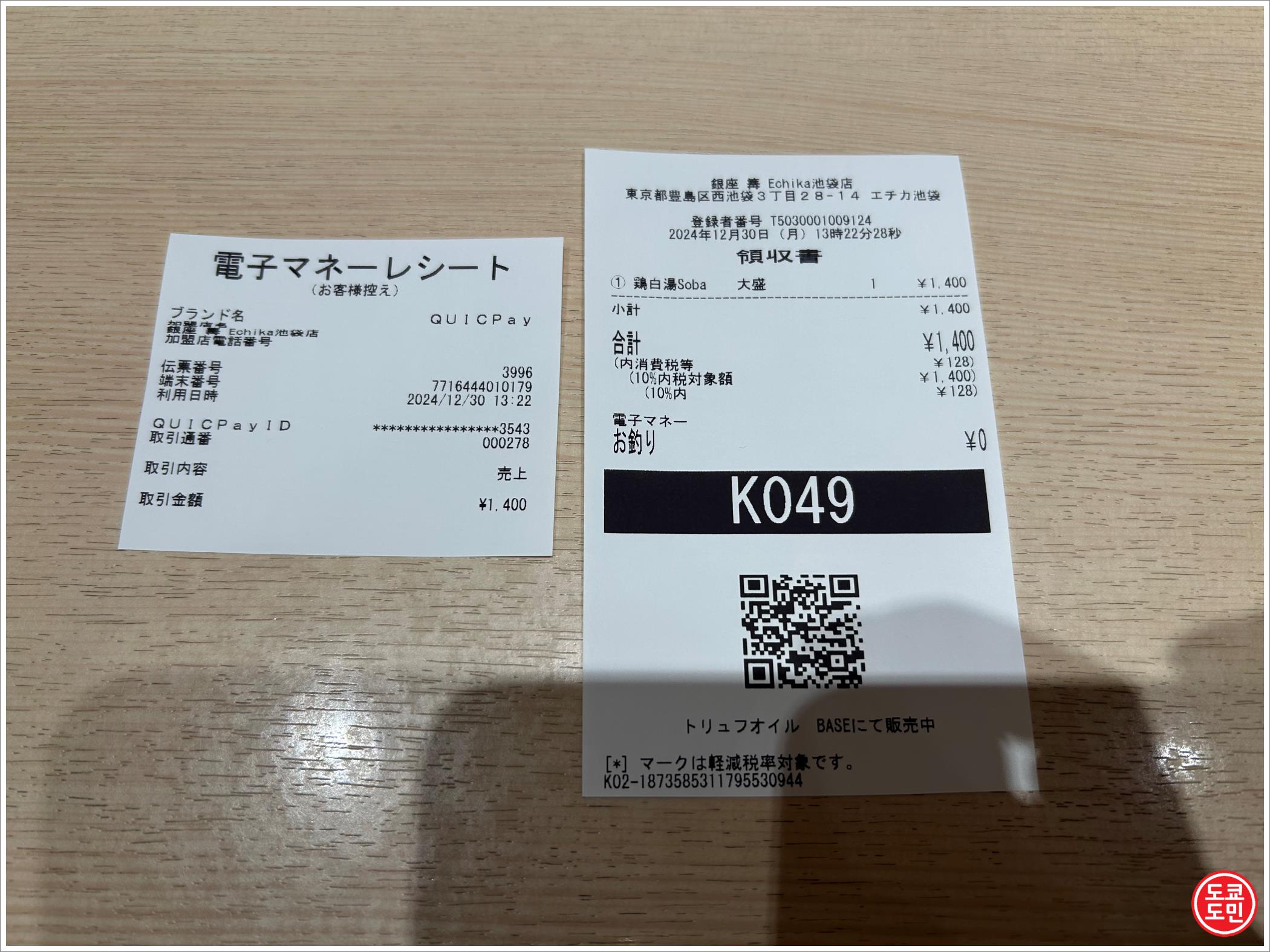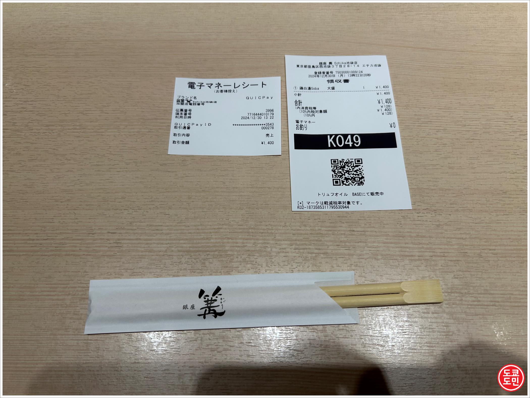 저는 1280엔짜리 토리파이탄 라멘을 곱배기로 주문해서 1400엔입니다.