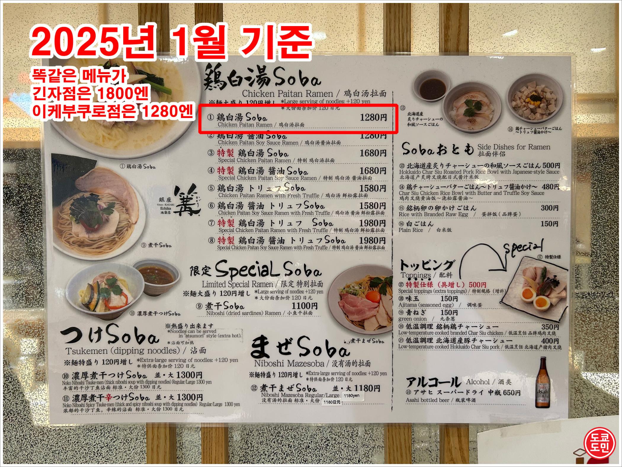 똑같은 메뉴인데, 긴자점은 1800엔, 이케부쿠로점은 1280엔입니다.