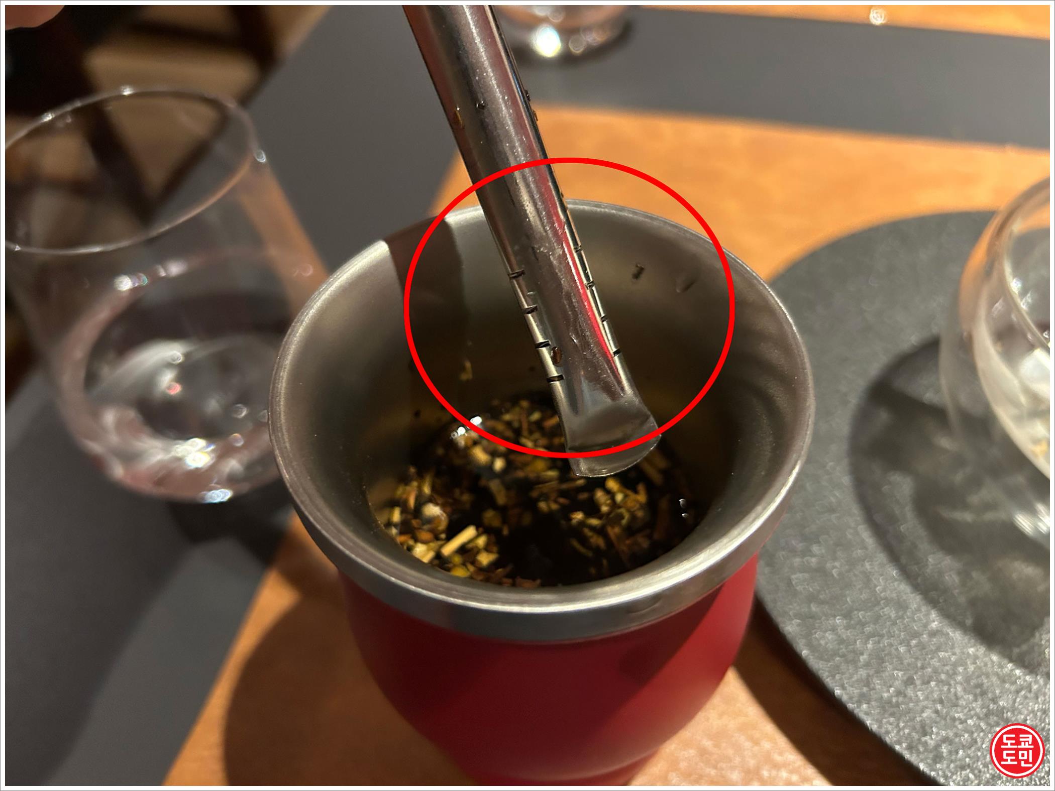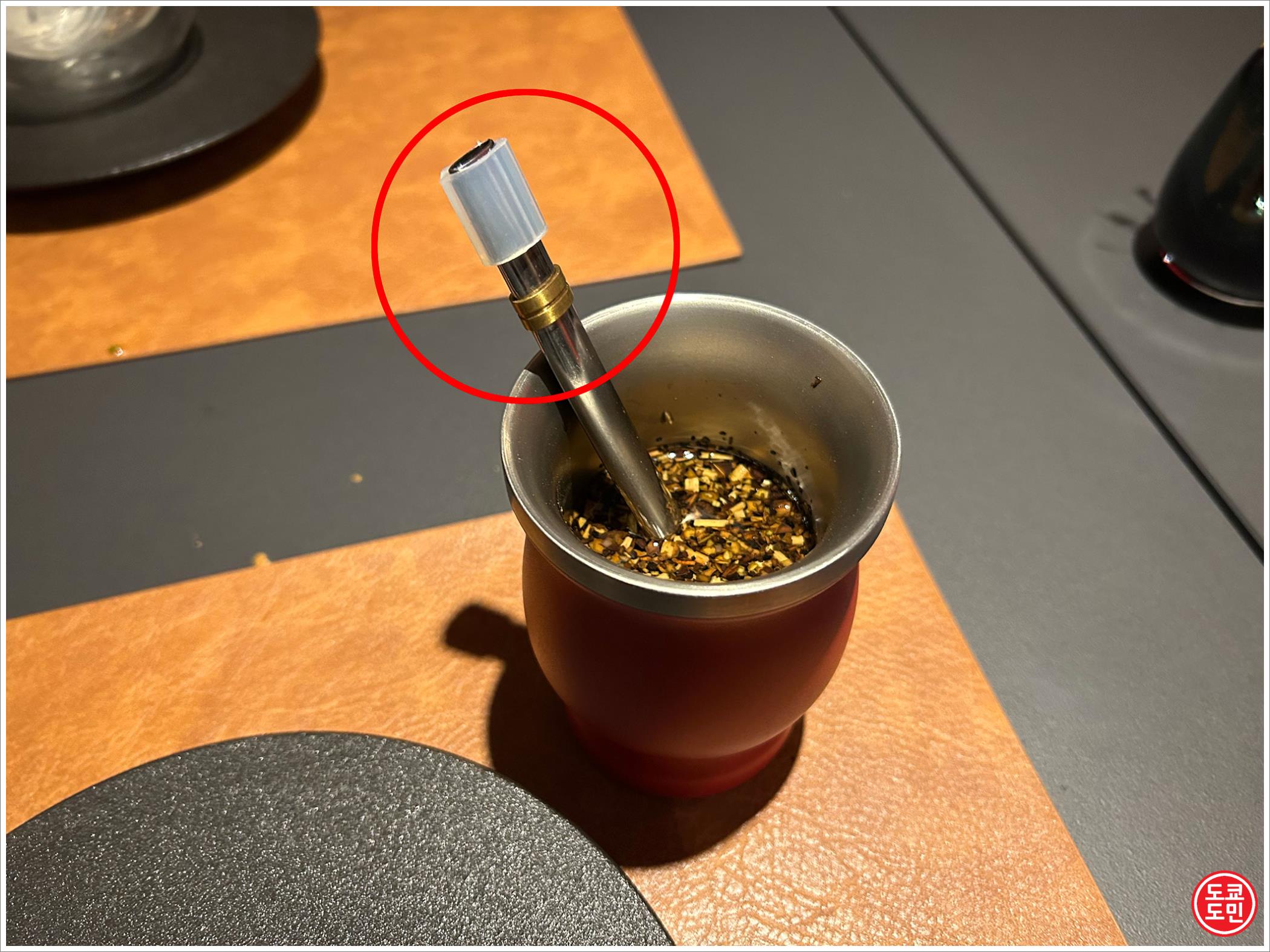 음료에 떠 있는 건더기가 나무 껍질 같은건데 빨대가 필터 역활을 제대로 못해서 건더기가 계속 올라옵니다.