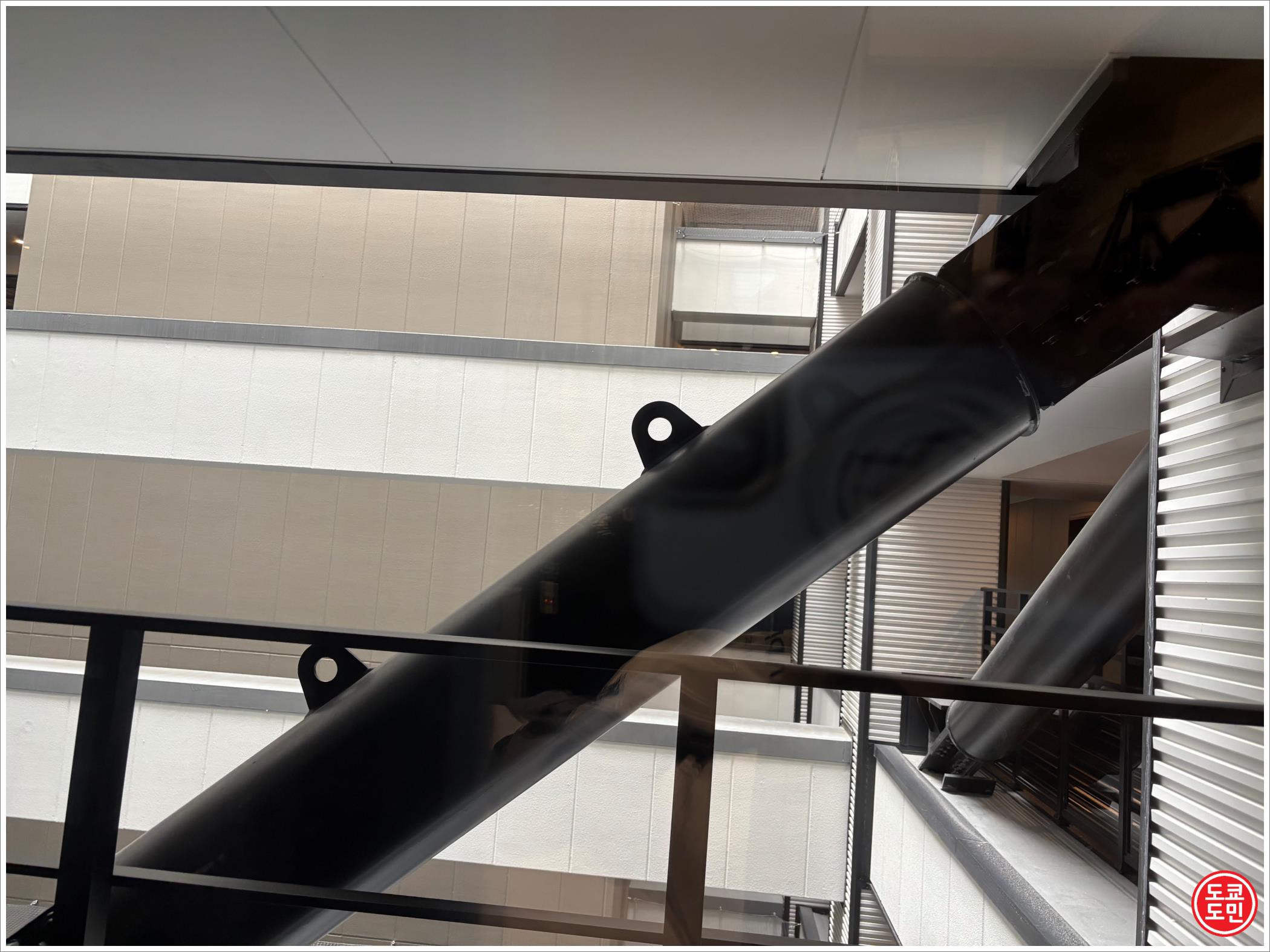 이 시꺼먼 대각선의 기둥이 지진이 나면 건물의 흔들림을 흡수해주는 내진장치입니다.