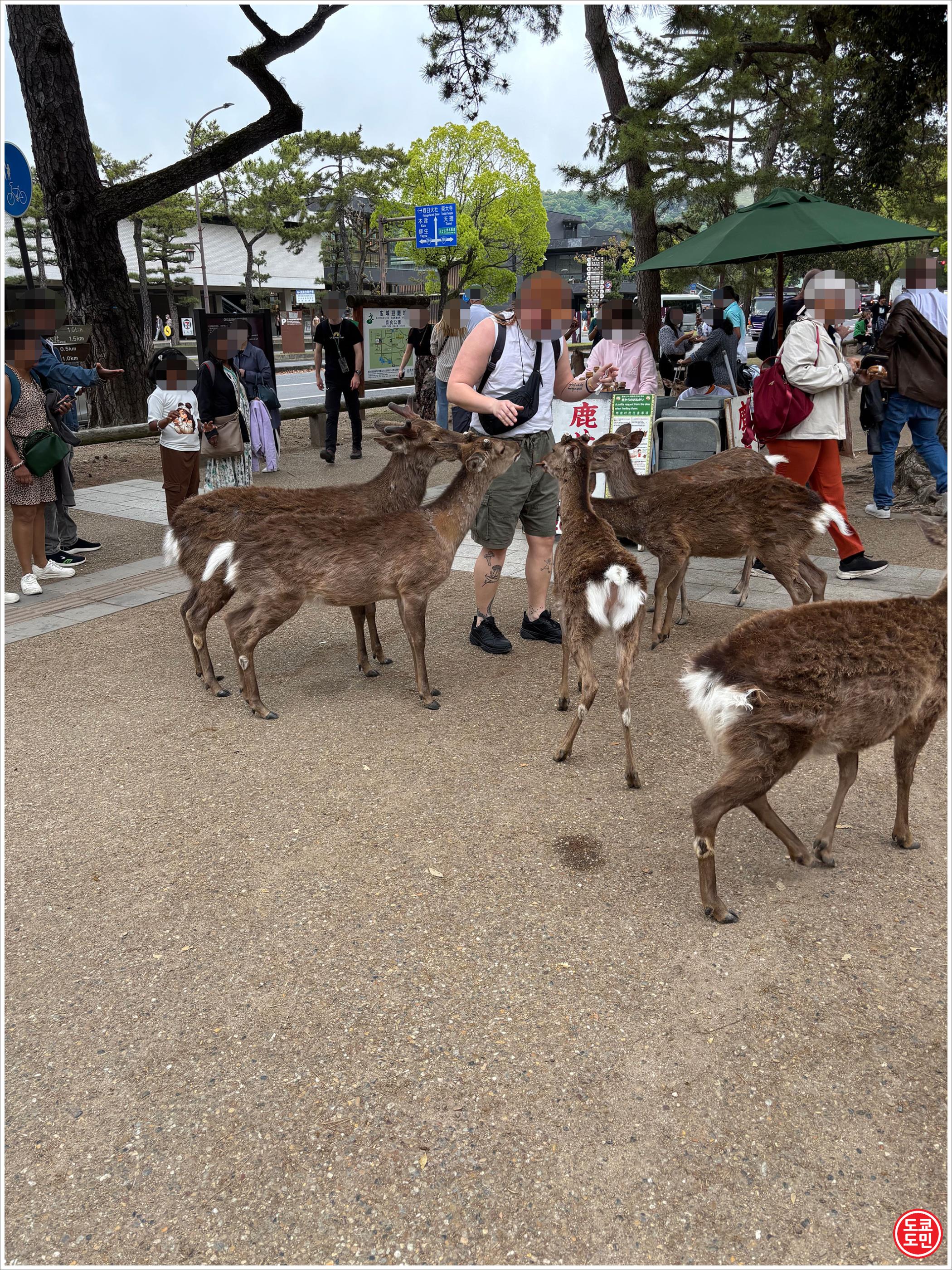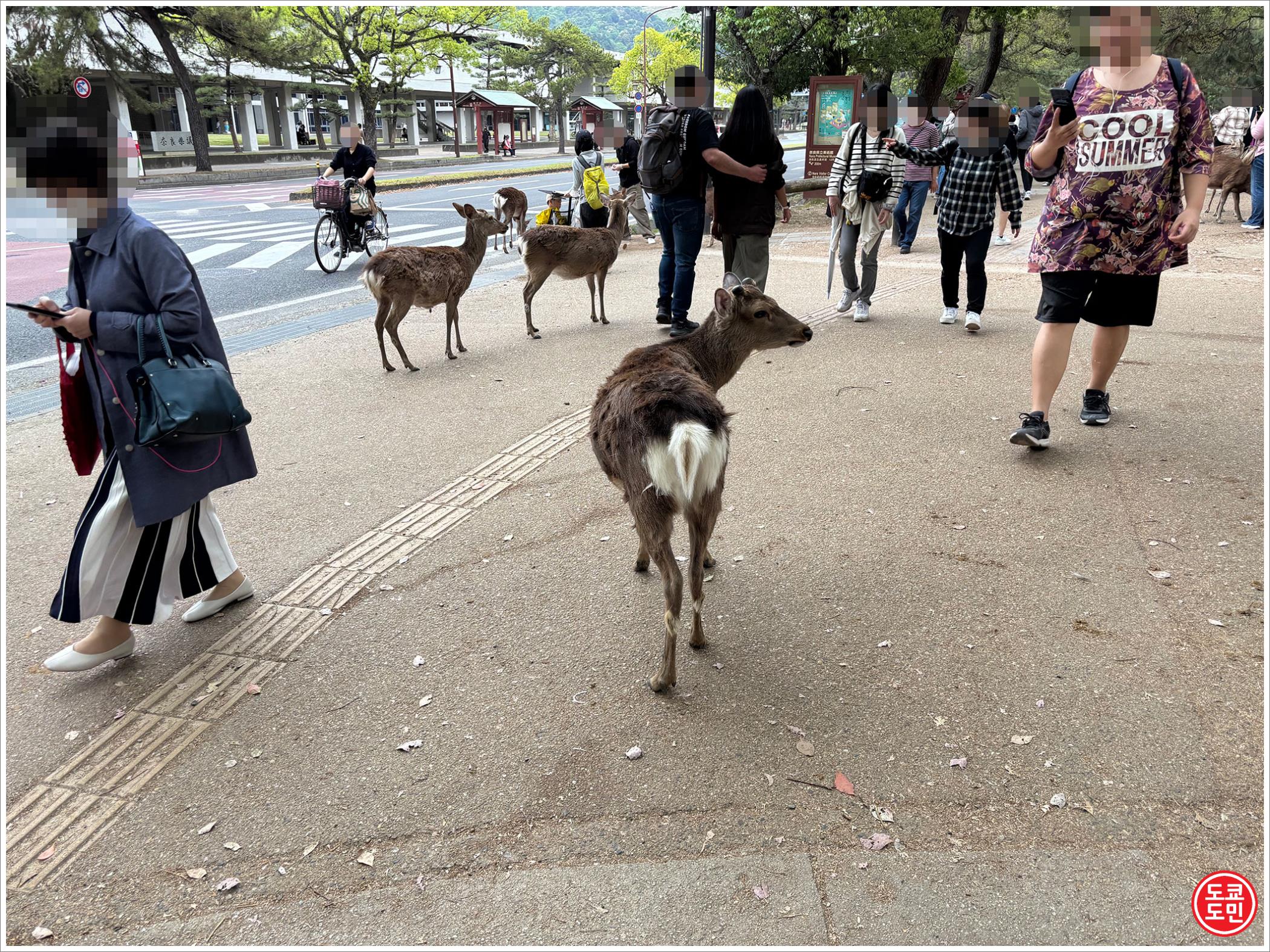 역에서 나와서 2~3분 걸으면 바로 인도에 사슴들이 잔뜩 있습니다.