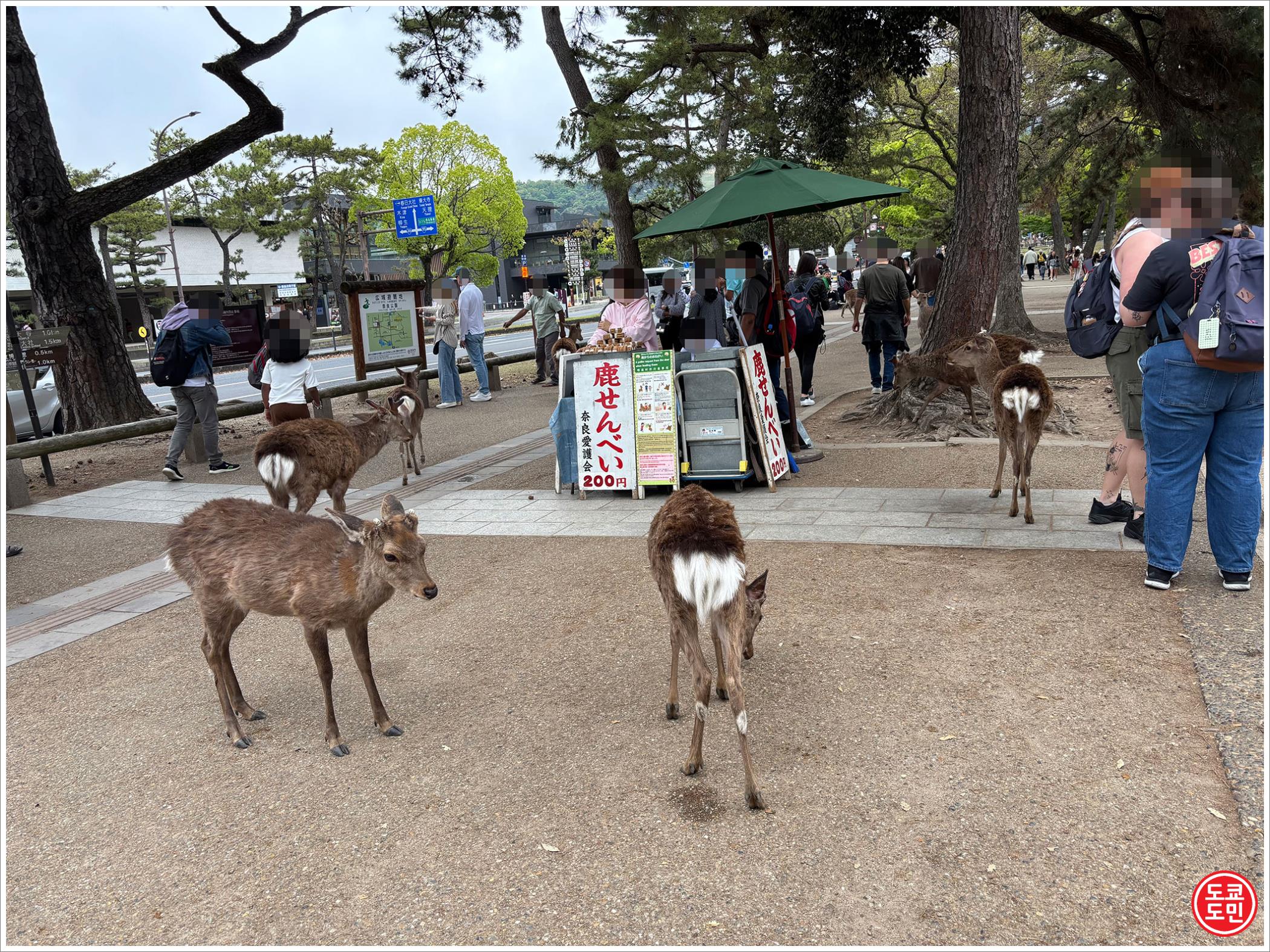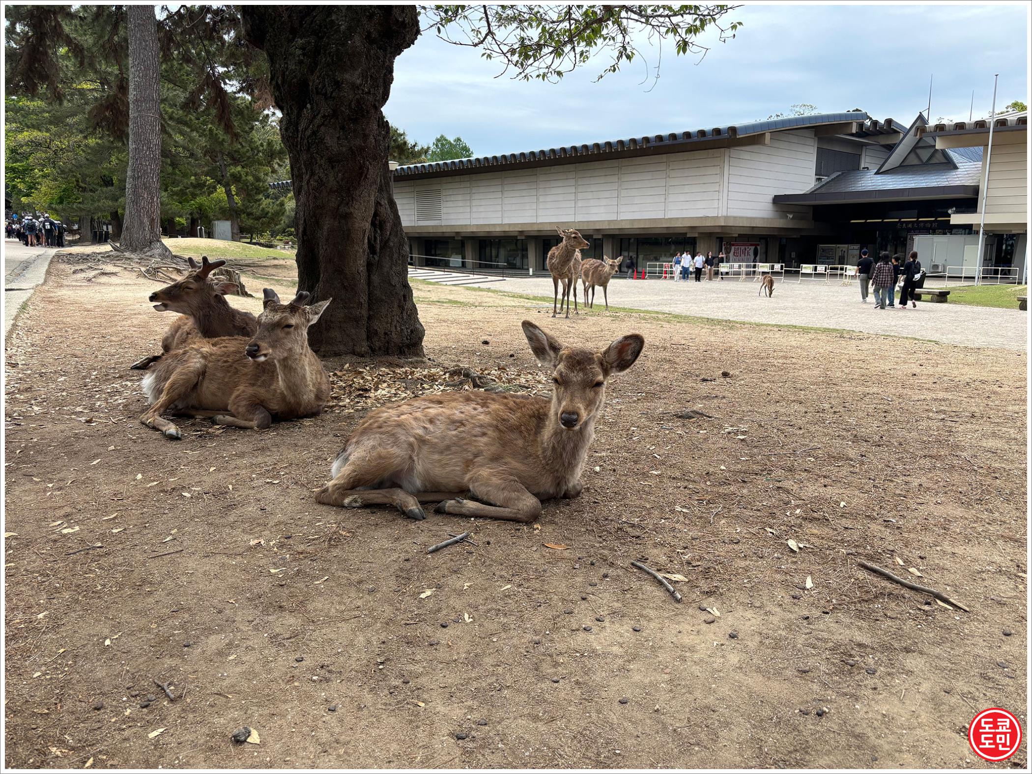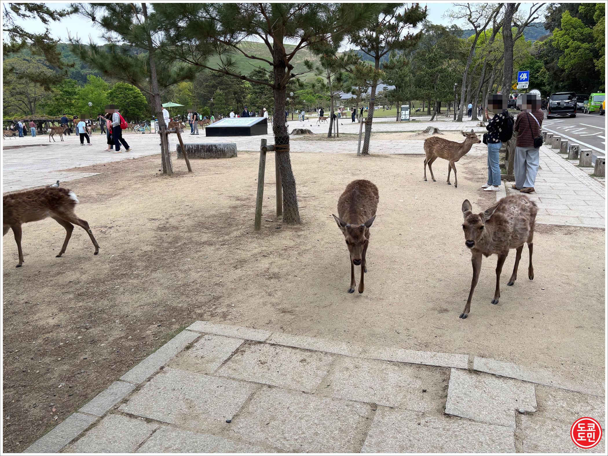 역에서 나와서 2~3분 걸으면 바로 인도에 사슴들이 잔뜩 있습니다.