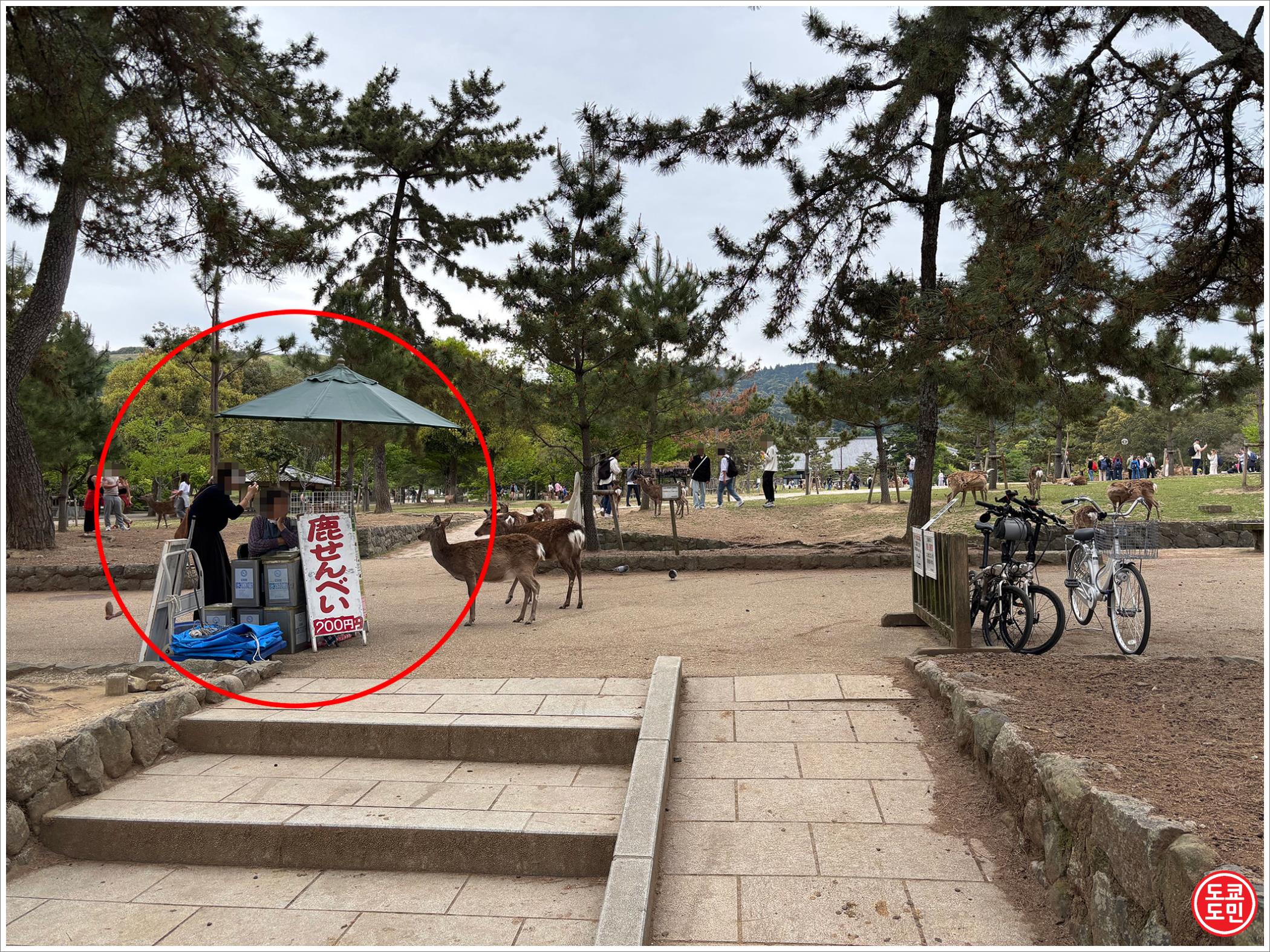 사슴먹이는 파라솔이 있는 저렇게 조그만한 곳에서 200엔에 판매하고 있습니다.