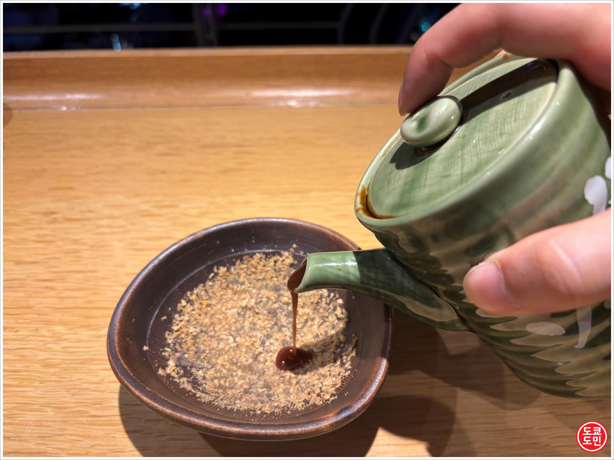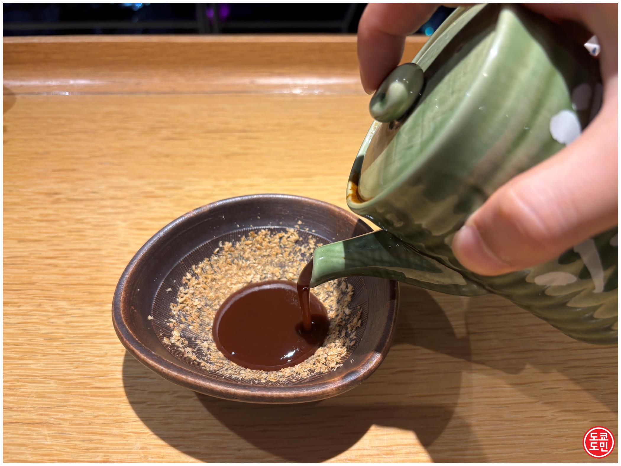 이렇게 갈고 난 다음에 여기에 돈카츠 소스를 부워줍니다.