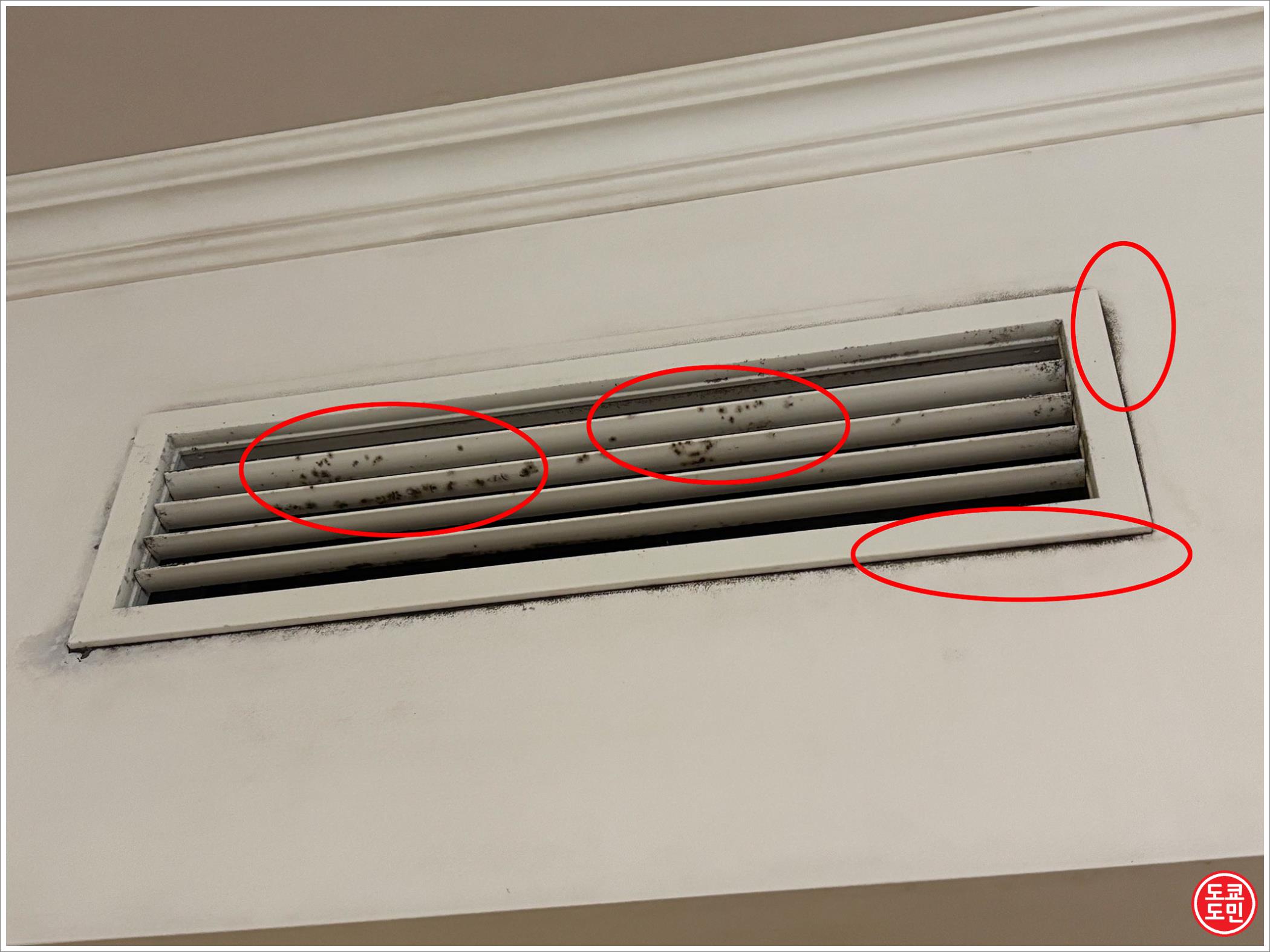 이 교체 받은 객실도 보니까 에어콘 바람 나오는 곳이 곰팡이로 가득!!