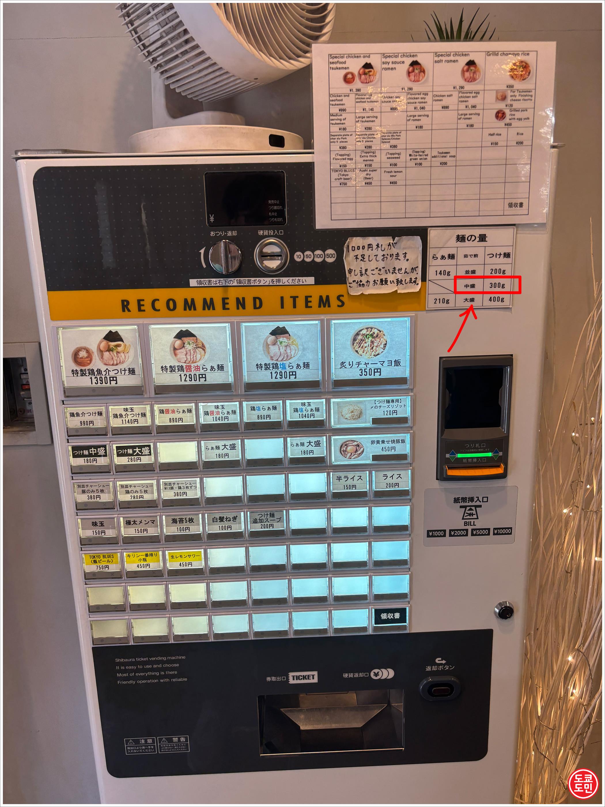 그냥 990엔짜리를 주문하면 면의 양이 보통인 200g 이고, 180엔짜리 "츠케멘 츄모리(つけ麵中盛)" 를 추가하면 면의 양이 300g 입니다.