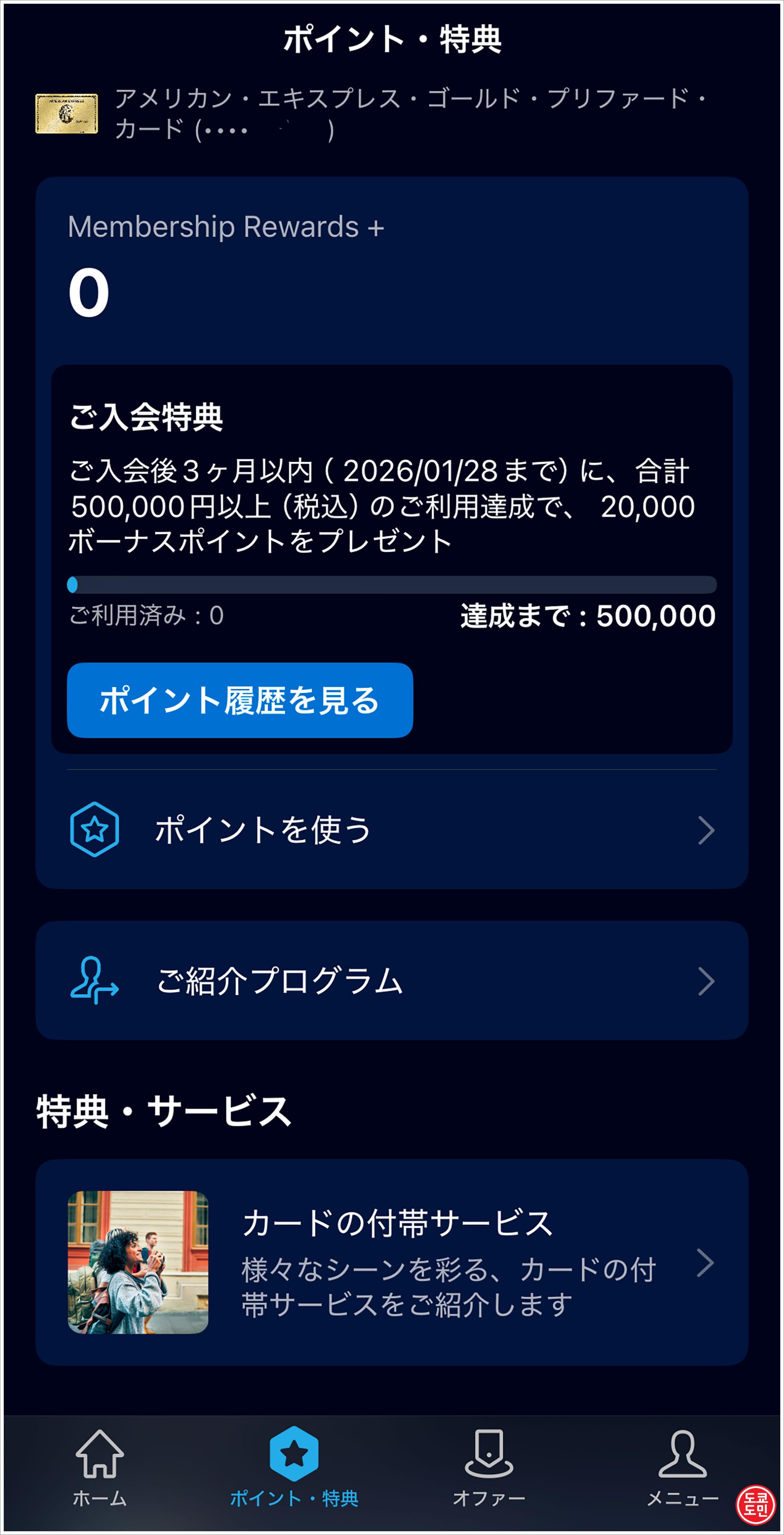 3개월 이내에 50만엔(약 500만원)을 사용하면 20,000포인트를 받을 수 있습니다.
