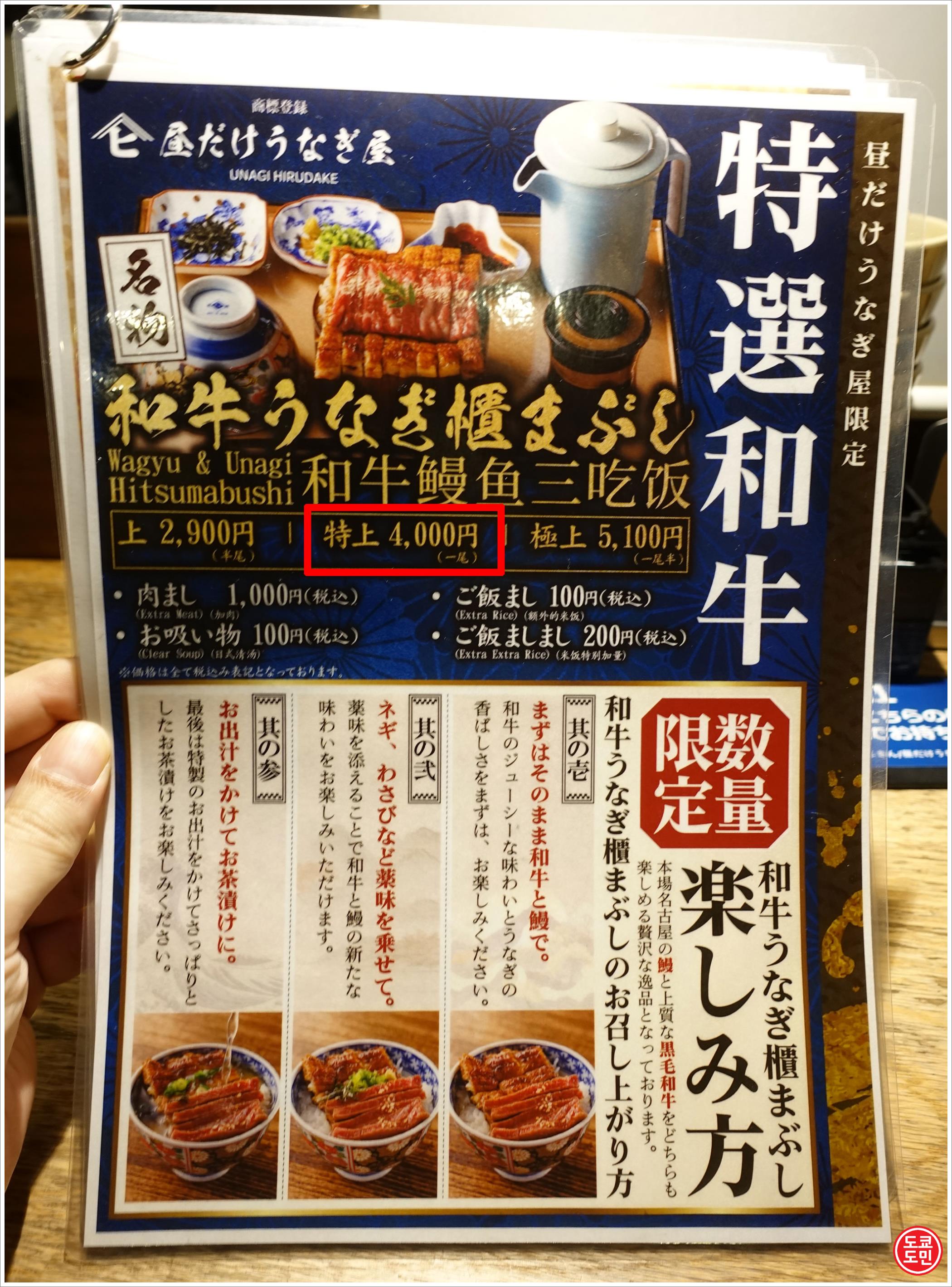 저는 처음에 히츠마부시로만 처음에 먹으러 왔는데, 너무 맛있어서 나고야 여행중 2번째 방문땐 이 점포만의 인기 메뉴인 우나기(장어)와 스테이크가 같이 나오는 "와규(소고기) 우나기 히츠마부시(和牛うがぎひつまぶし)"를 주문했습니다.