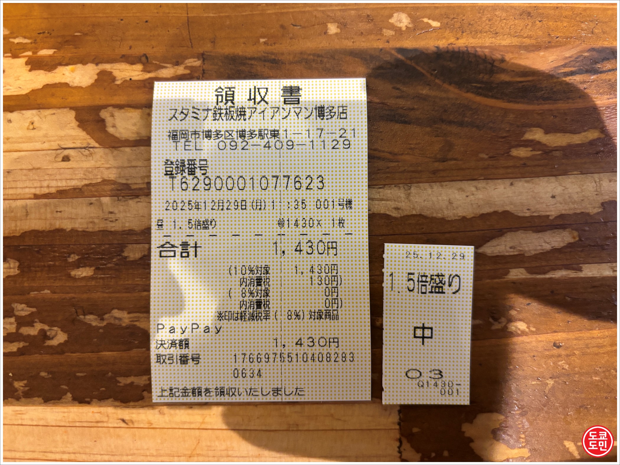 저는 이번에 스테미너 철판구이 1.5배 (スタミナ鉄板1.5倍盛り)를 주문했습니다.