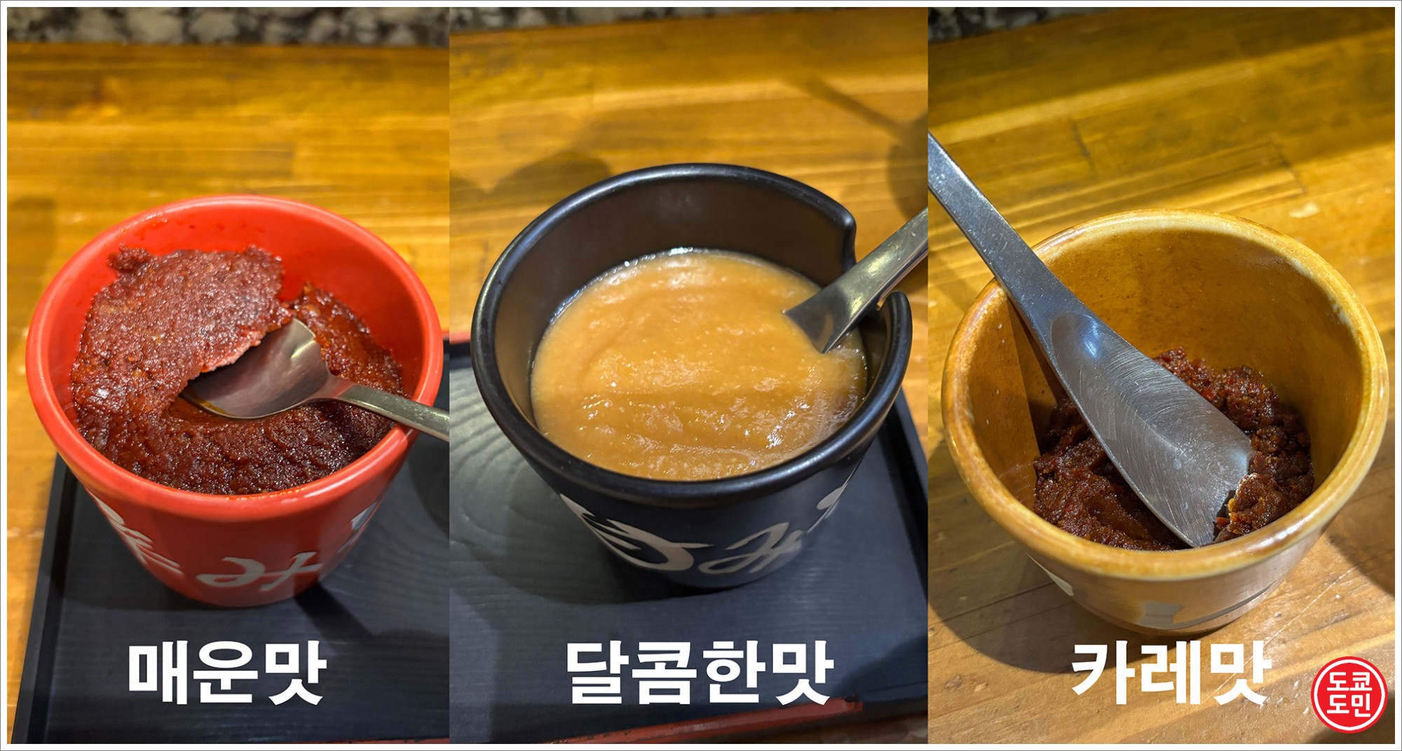 양념장은 매운맛, 달콤한맛, 카레맛이 있는데, 매운맛을 추천합니다.