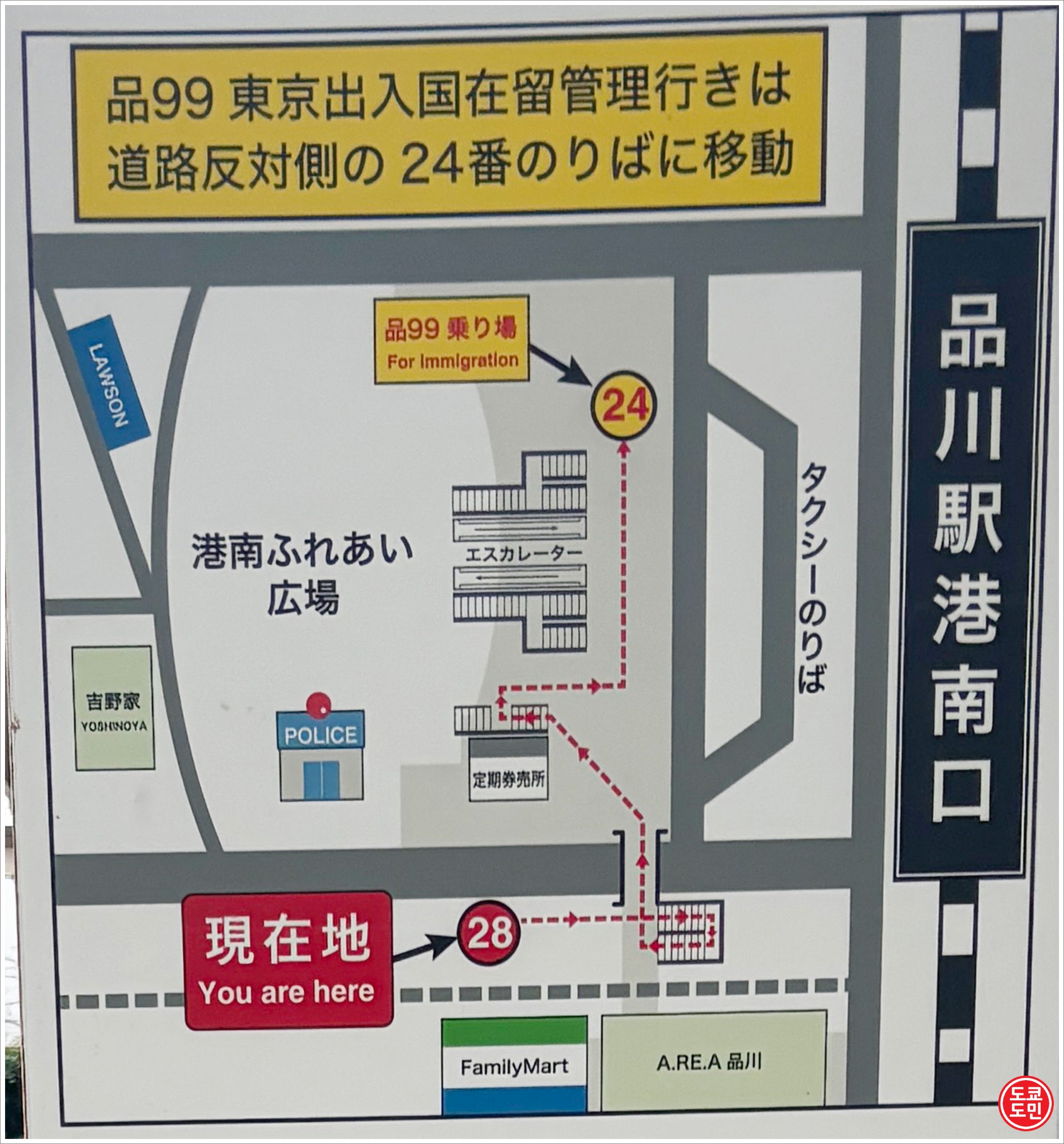 시나가와역 고난출구의 중앙에 있는 에스컬레이터로 내려오면 바로 뒷쪽에 24번 정류장에서 "品99" 를 타면 됩니다.