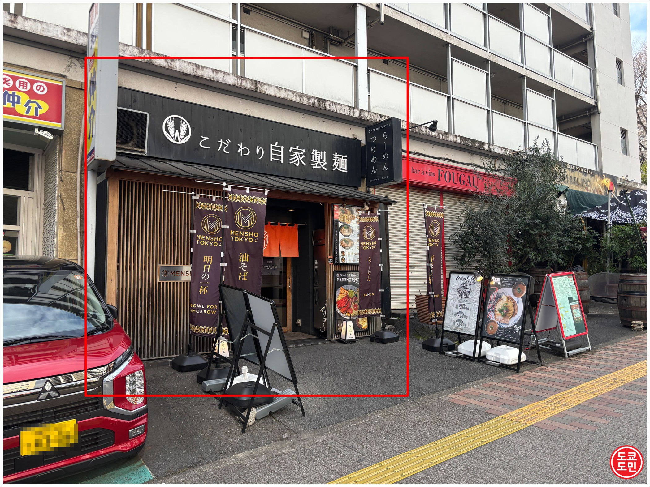 도쿄 고라쿠엔역(도쿄돔) 근처의 큰 사거리에 있는 라멘 가게인 "멘쇼 도쿄(MENSHO TOKYO)" 외관입니다.