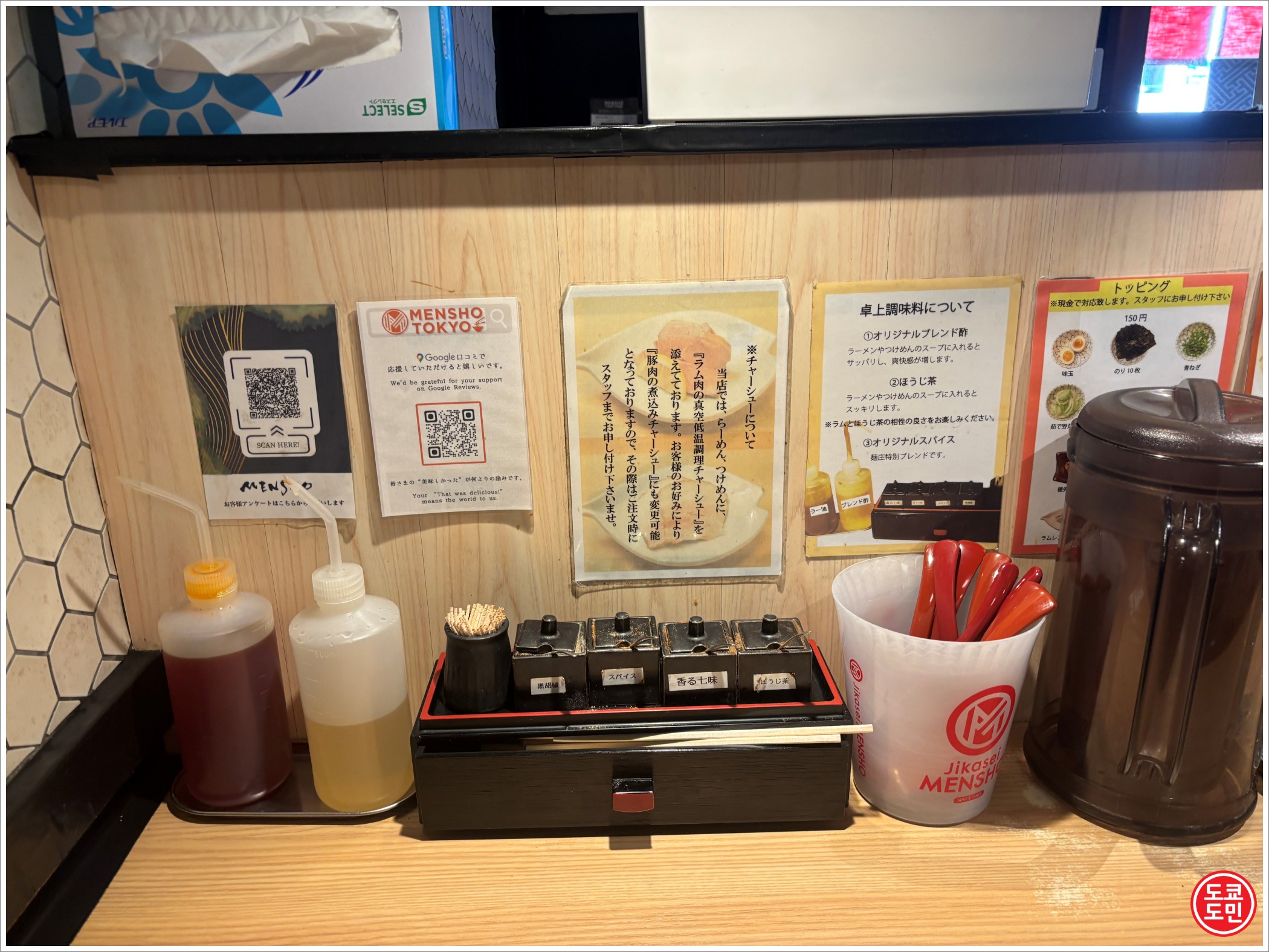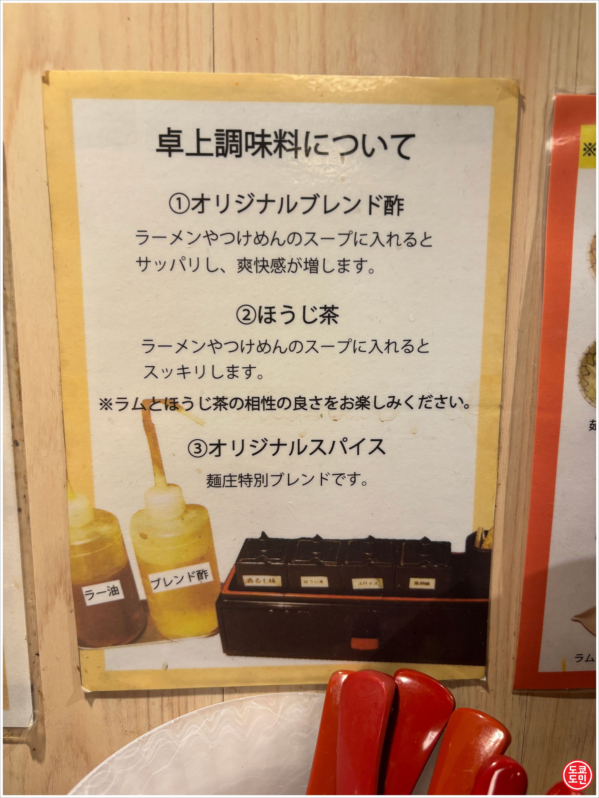 테이블에 놓여있는 식초나 호지차는 면에 뿌려 먹거나 스프에 넣어서 맛을 바꿔가면서 먹어보라고 설명이 되어 있습니다.