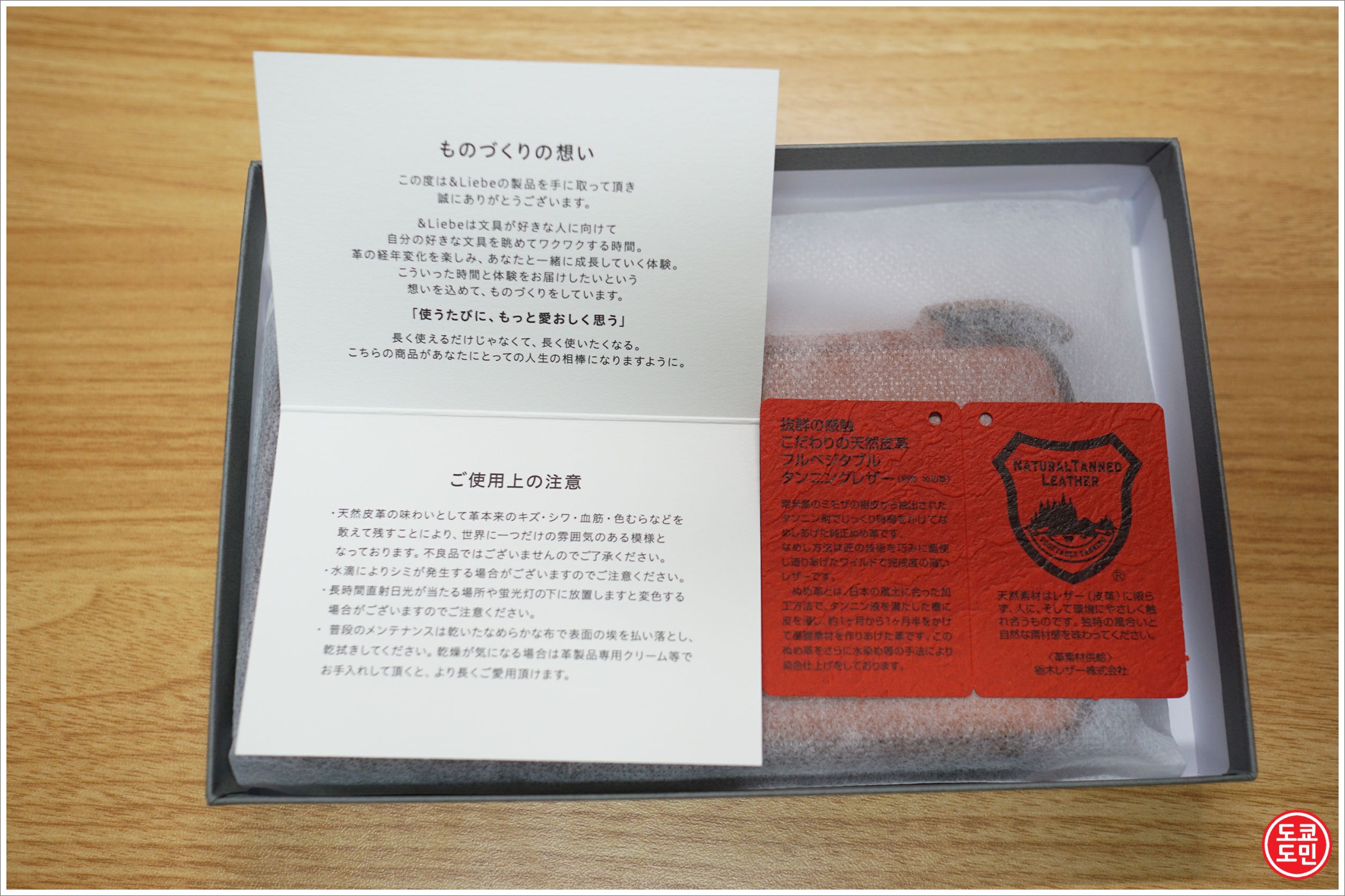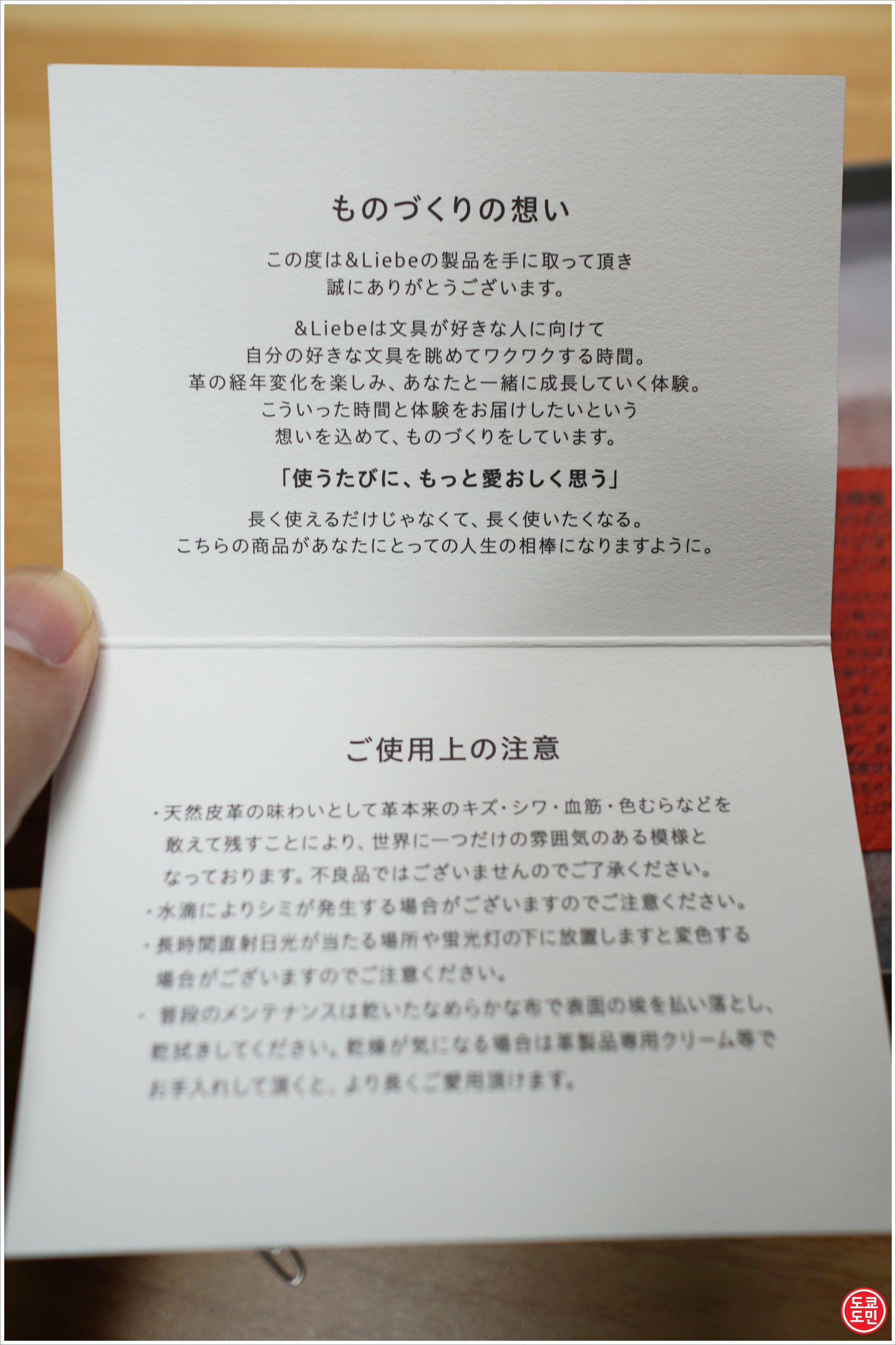 이 &Liebe의 펜케이스는 도치기 가죽을 사용을 했다는것과 주의사항이 적혀있습니다.