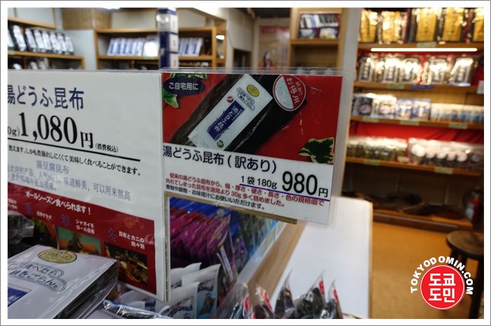 그옆에 크기가 조금 맞지 않거나 조금 부서지거나한 다시마는 980엔에 팔고 있었어요.