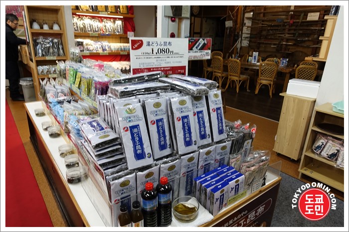 다시마(콘부)의 종류도 아주 많고 다시마 차도 무료로 한잔 마실 수 있습니다.