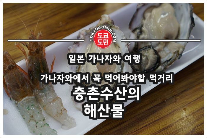가나자와의 오미초시장에 가시면 충촌수산에서 이 신선한 해산물들을 꼭 드셔보시라고 추천드리고 싶어요.