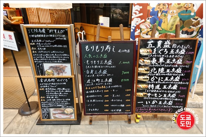 그중에서도 가나자와 관광지 중 한곳인 수산시장인 '오미초시장'내에 있는 '모리모리스시(もりもり寿司)'라는 회전초밥집에 먹으러 갔습니다.