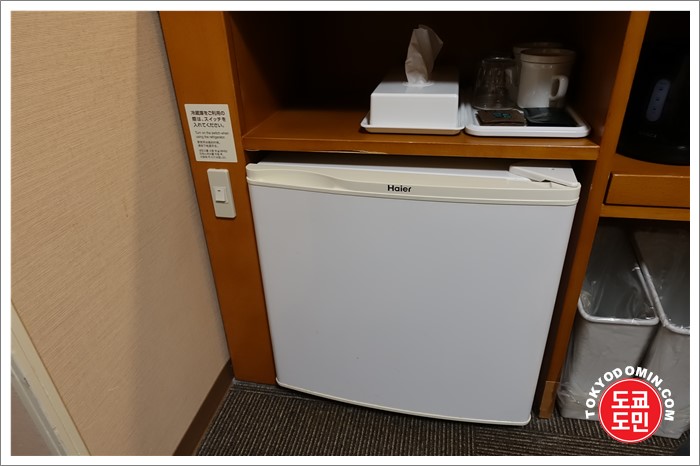 티비밑에는 조그만한 냉장고가 있습니다.