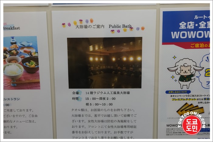 호텔 숙박자라면 무료로 이용가능한 인공온천(목욕탕)인데요.