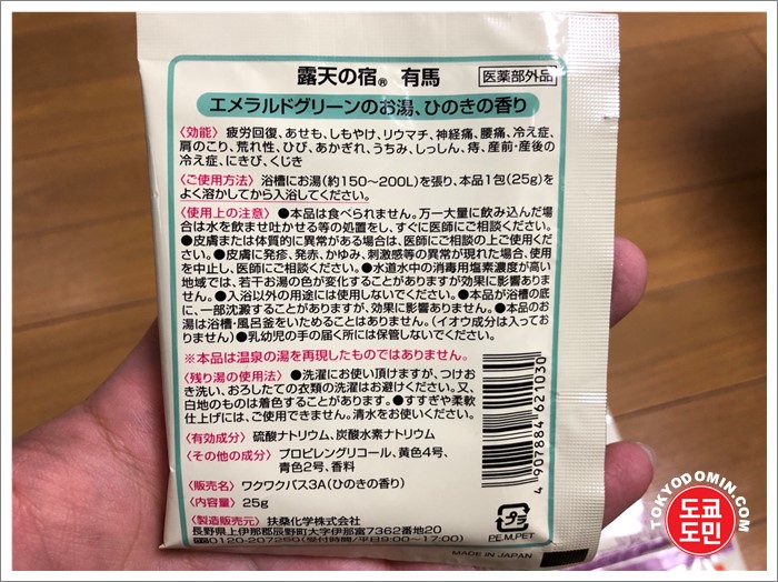 뒷면에는 온천 입욕제 사용방법과 아리마 온천의 특징과 효능 등이 적혀 있습니다.