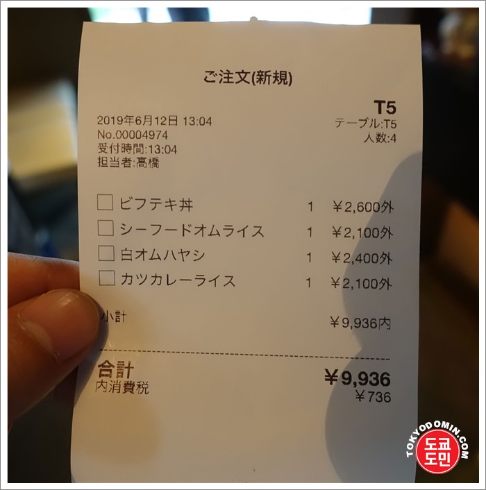 1인당 약 2500엔가량의 음식을 주문했기에 소비세포함해서 가격이 9936엔이네요.
