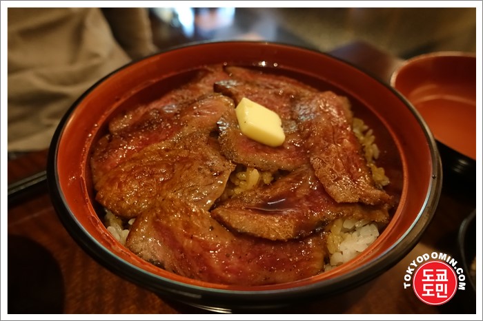 이건 메뉴판에 파란색으로 표시한 '비프데키동(赤坂名物ビフテキ丼)'입니다.