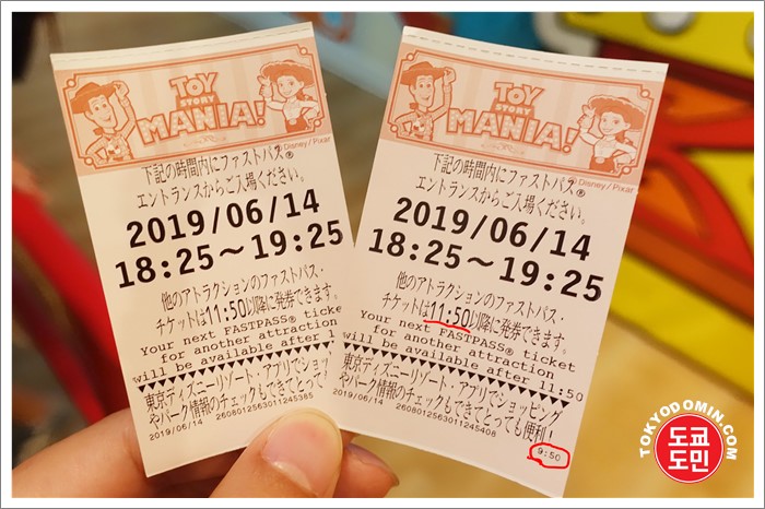 예를 들면 '토이스토리 매니아' 어트랙션 타는 곳 근처에서 발급 가능한 '패스트 패스(Fast Pass)'는 '토이스토리 매니아' 전용 패스트패스만 발급 가능합니다.
