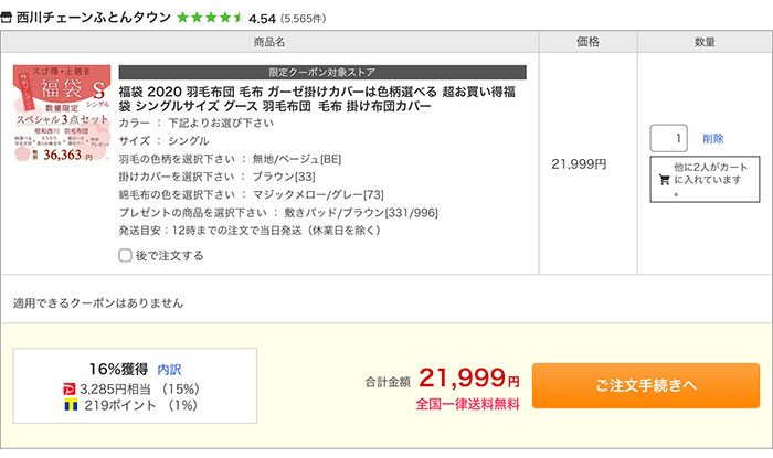니시카와(西川) 거위털(구스다운) 럭키백 40만원짜리 구성품
